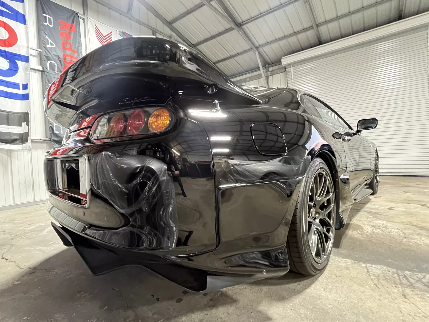 The car is equipped with a Veilside kit (front bumper, skirts, spats, rear spoiler, and diffuser). It has 18” XXR wheels, and an aftermarket exhaust.