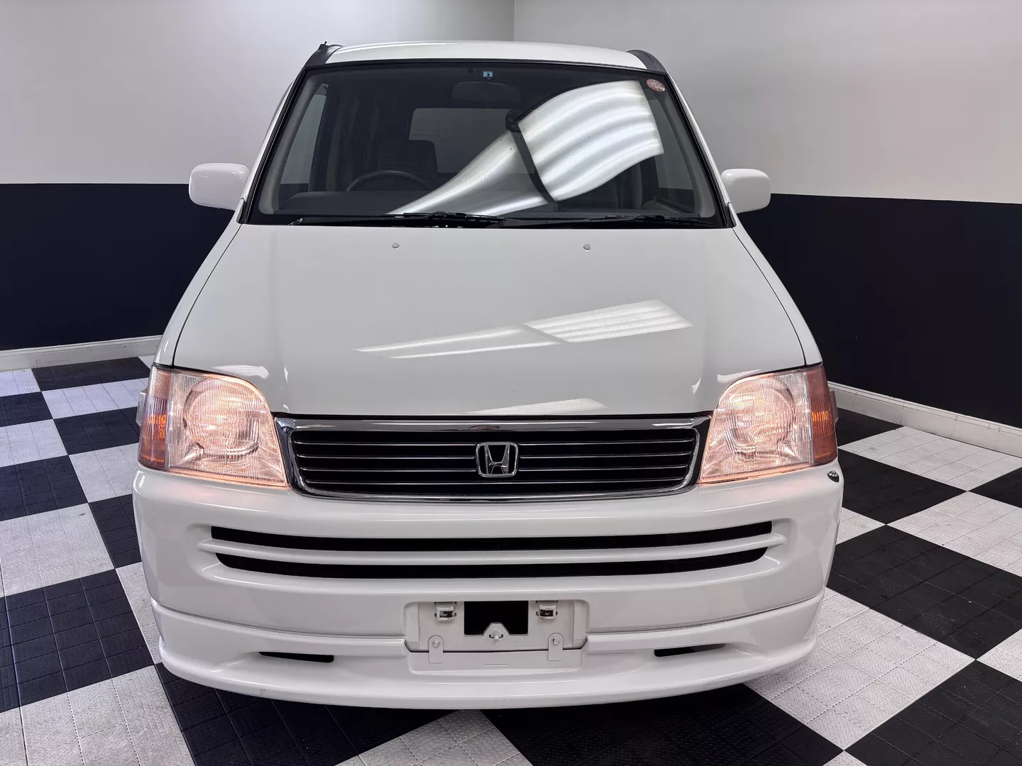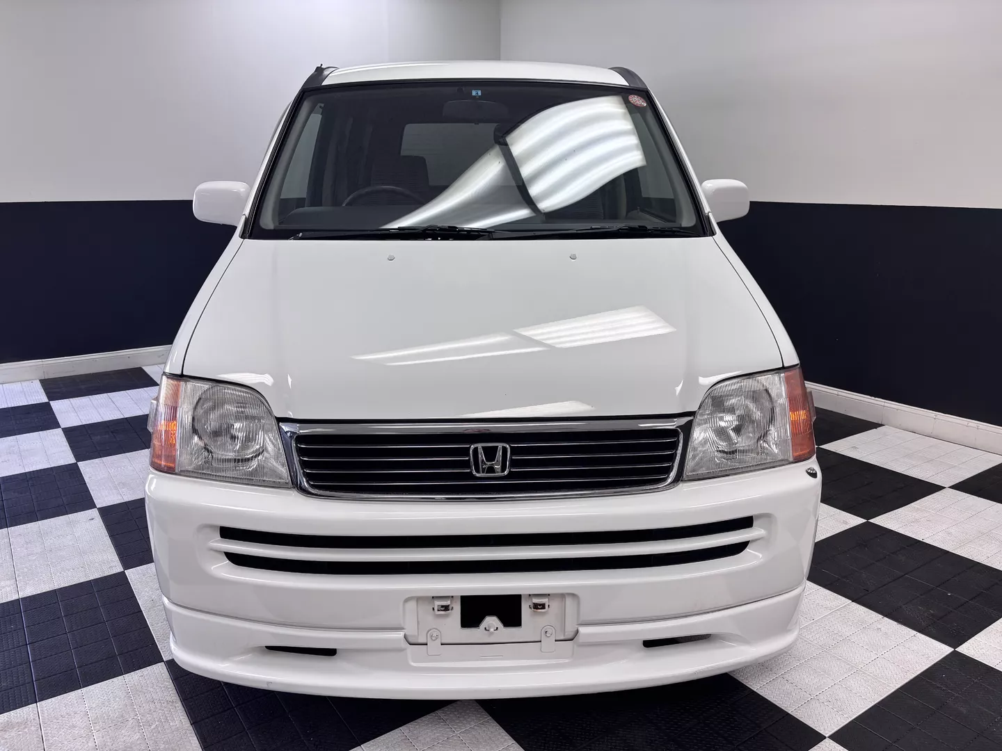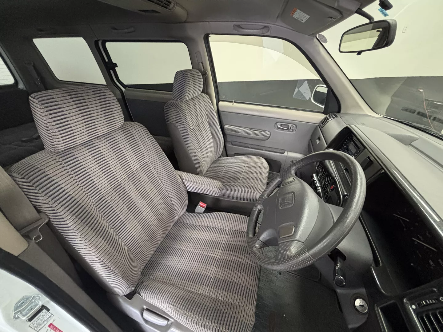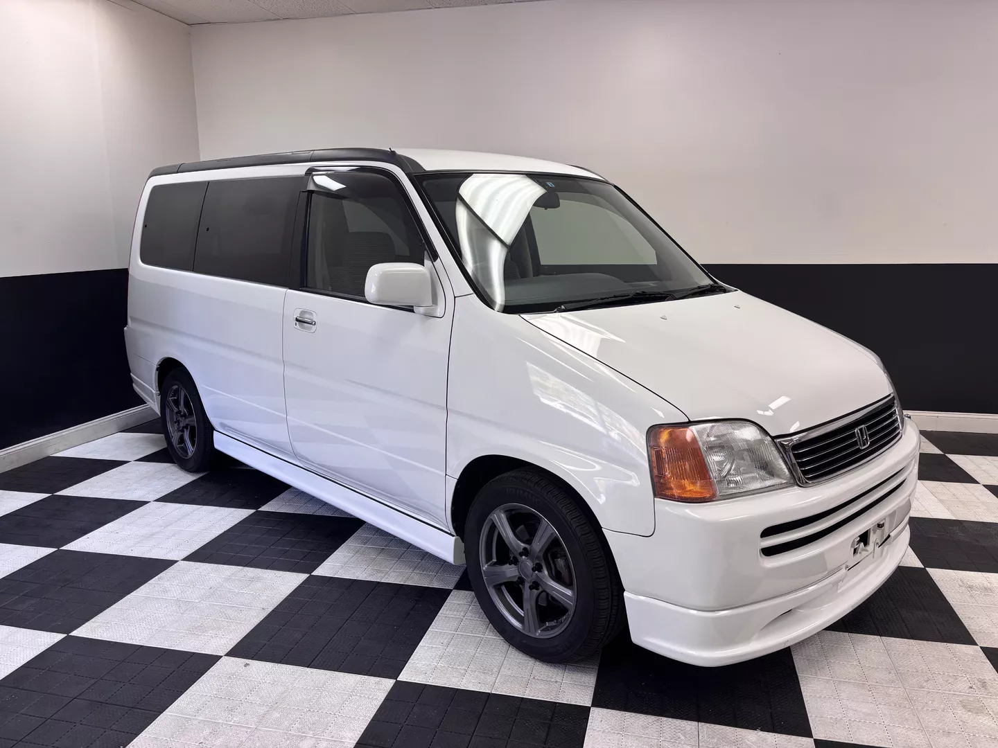 This 1998 Honda StepWgn is painted in white with a factory gray cloth interior. The car features a B20B Honda four-cylinder mated to a four-speed auto transmission, It is front-wheel drive. 3 rows of seating, factory low down kit, wind visors and new tires.