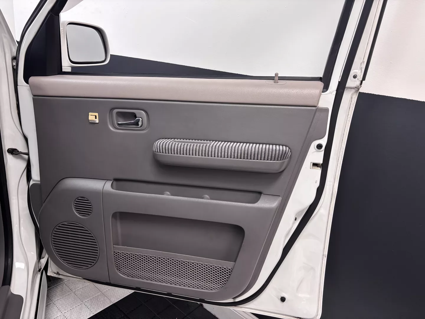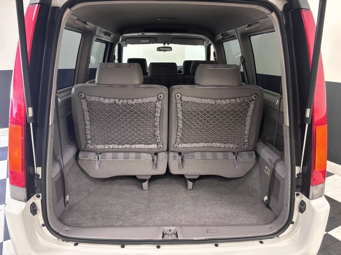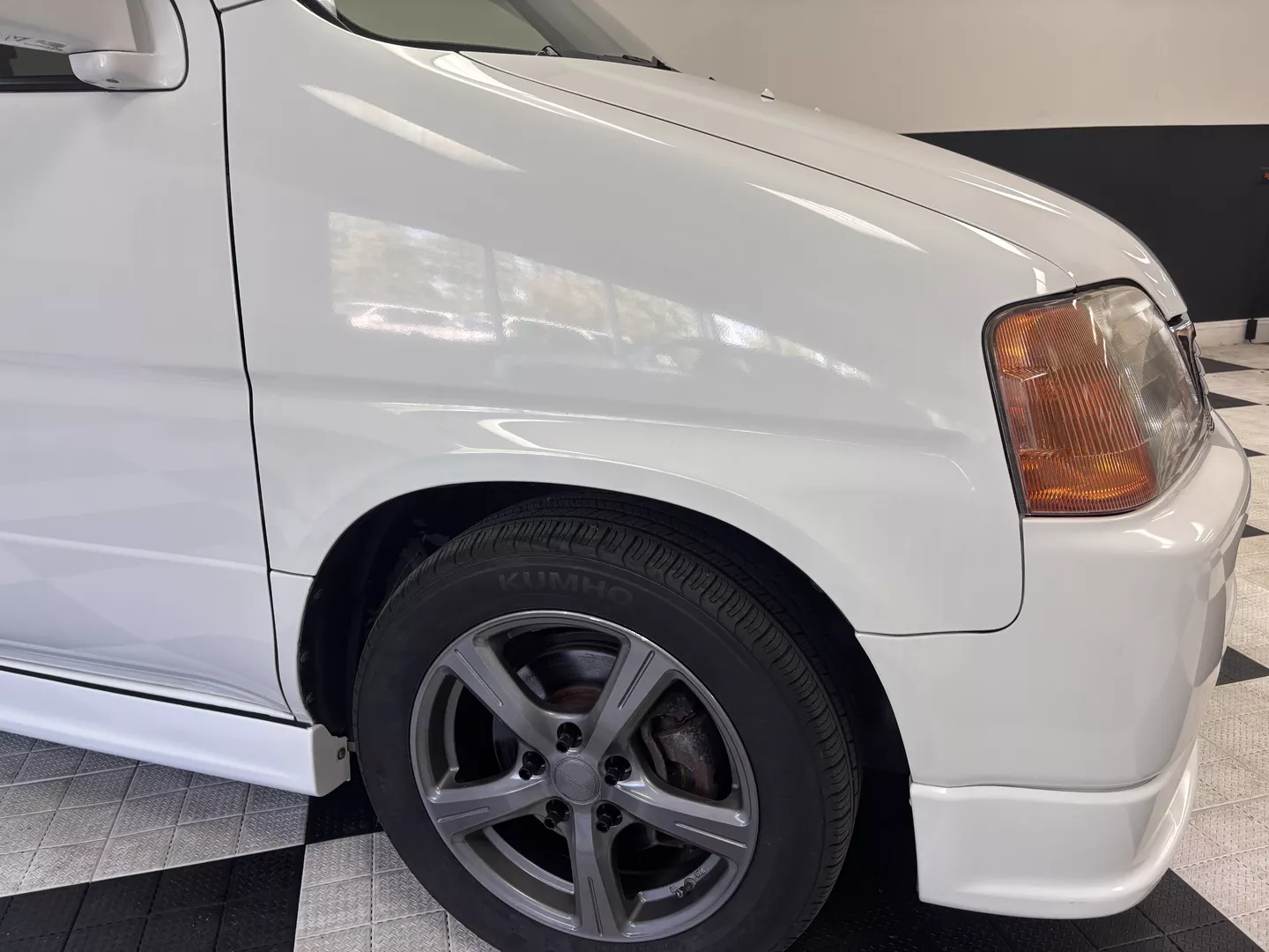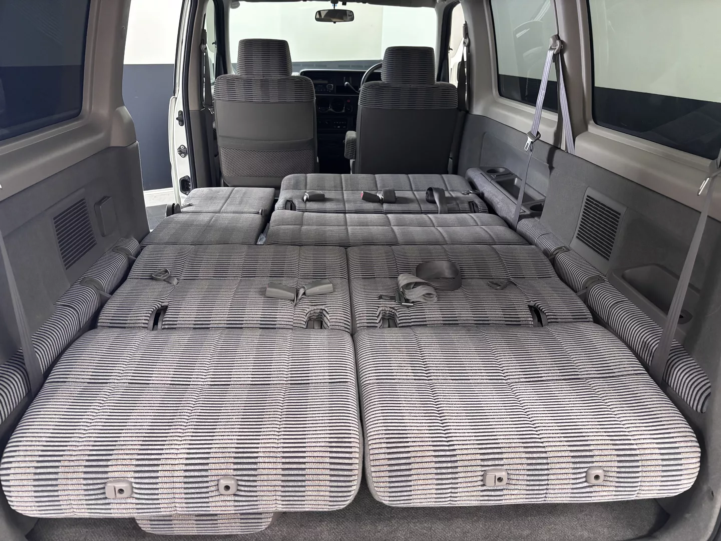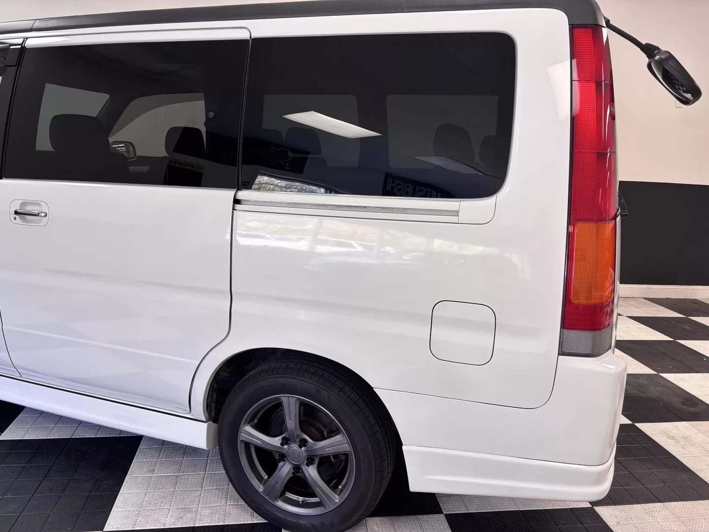 This 1998 Honda StepWgn is painted in white with a factory gray cloth interior. The car features a B20B Honda four-cylinder mated to a four-speed auto transmission, It is front-wheel drive. 3 rows of seating, factory low down kit, wind visors and new tires.