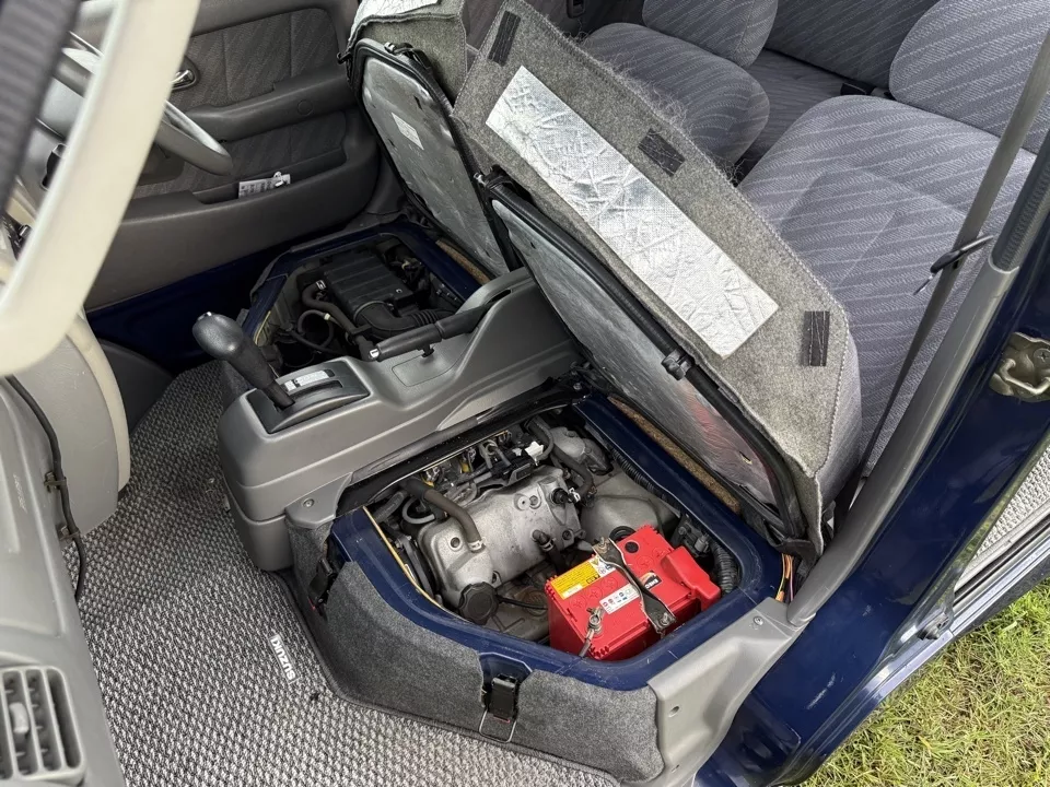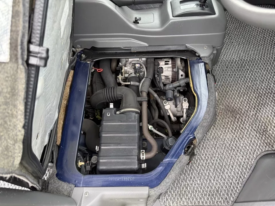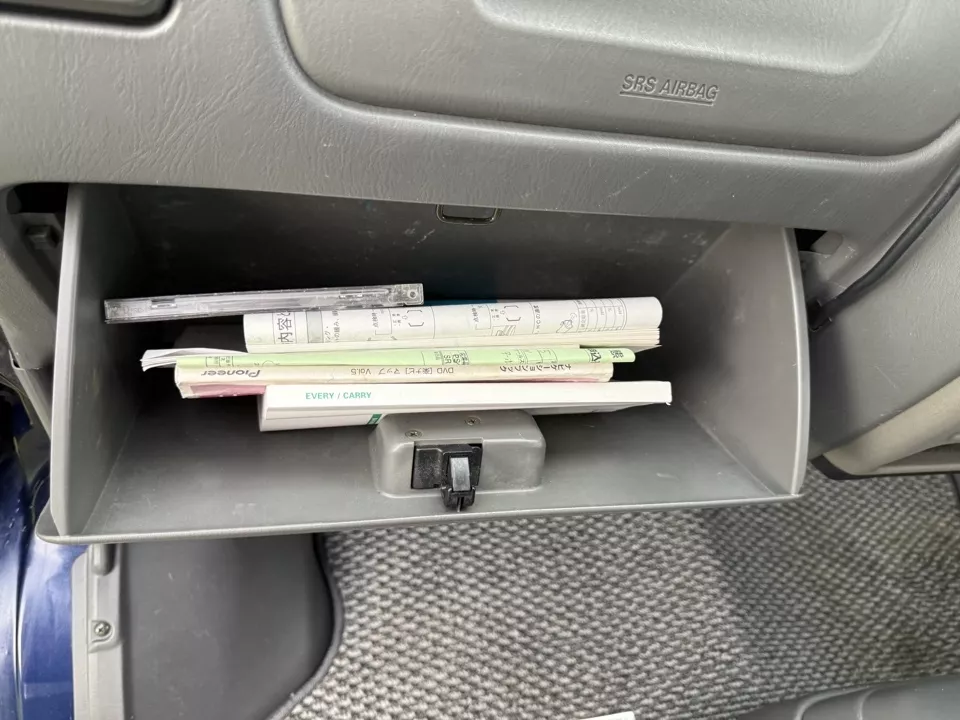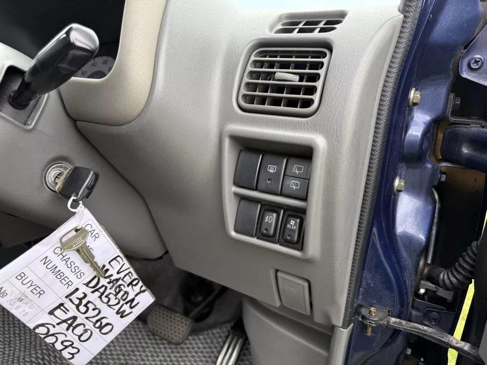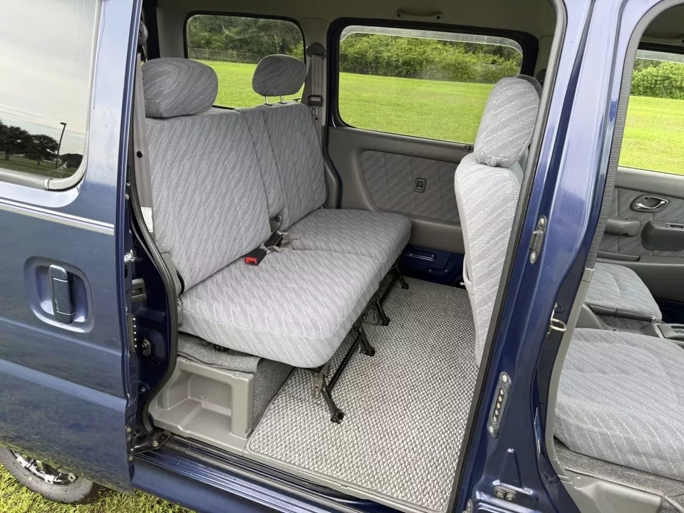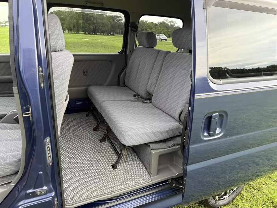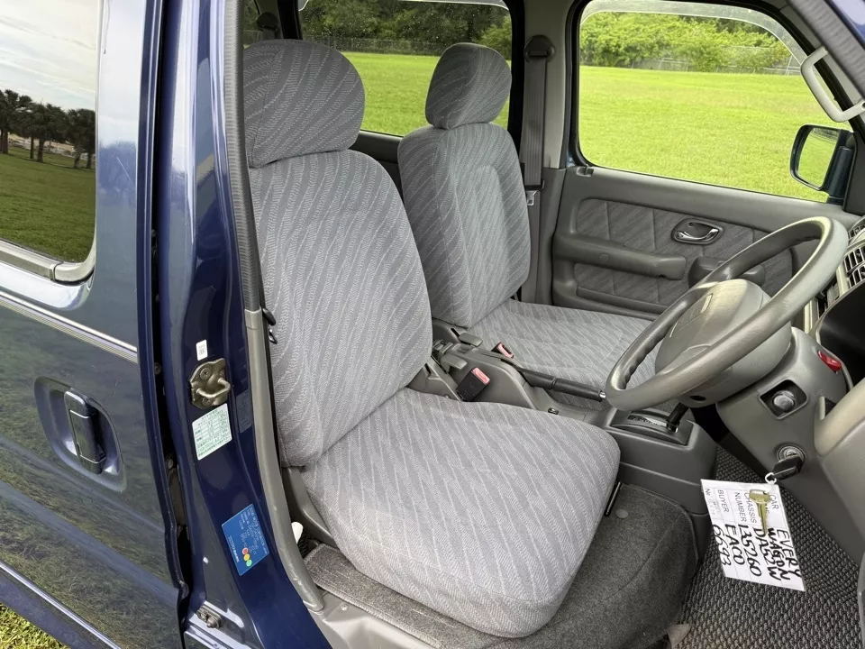 2000 Suzuki Every Joy Pop Kei Van RWD for four-person, beck passenger seat belts, It is powered by a 657cc turbocharged inline-three F6A Engine, linked with a three-speed automatic transmission. Finished in Blue Z2U Code Color, over patterned gray cloth, the van features 12″ Alloy wheels with new Bridgestone tires, front disc brakes, window rain guards, and a rear wing as well as carpeted floor mats, air conditioning, power windows, dual sliding side doors, and an Carrozeria head unit with navigation. Features fog lights, window tint film, a rear wing, and a single exhaust outlet.