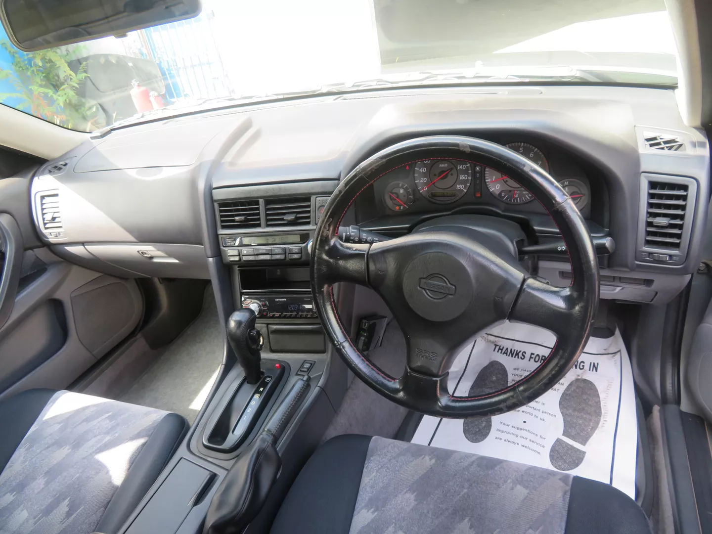 The vehicle is equipped with air conditioning that blows cold, power windows, and a clean interior. The RB20DE 2.0L 6-cylinder engine runs strong, and the automatic transmission shifts smoothly into all gears. The car drives straight, indicating a well-maintained alignment and suspension system.