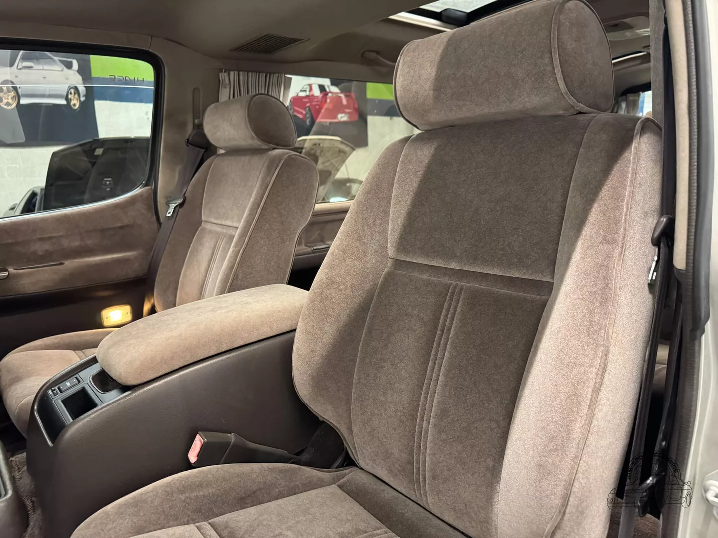 The exterior of this HiAce features a Flaxen Mica Metallic over Topaz Metallic (color code 2AX) two-tone finish, a popular combination on Japanese vans of this era. Its unique and enduring body style is further enhanced by tasteful custom decals, making this van a true show-stopper wherever it goes. Factory rain guards and rear privacy glass add both practicality and comfort, while the paint retains a deep, consistent shine. Combined with the van’s clean proportions and high roofline, these details ensure the HiAce stands out on the road with unmistakable presence and style.