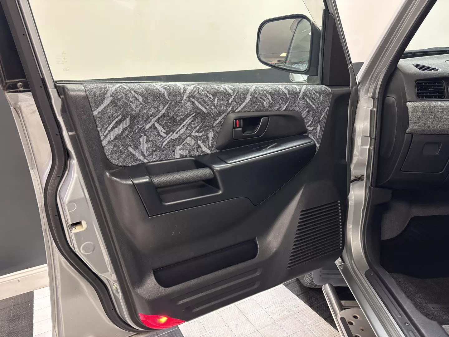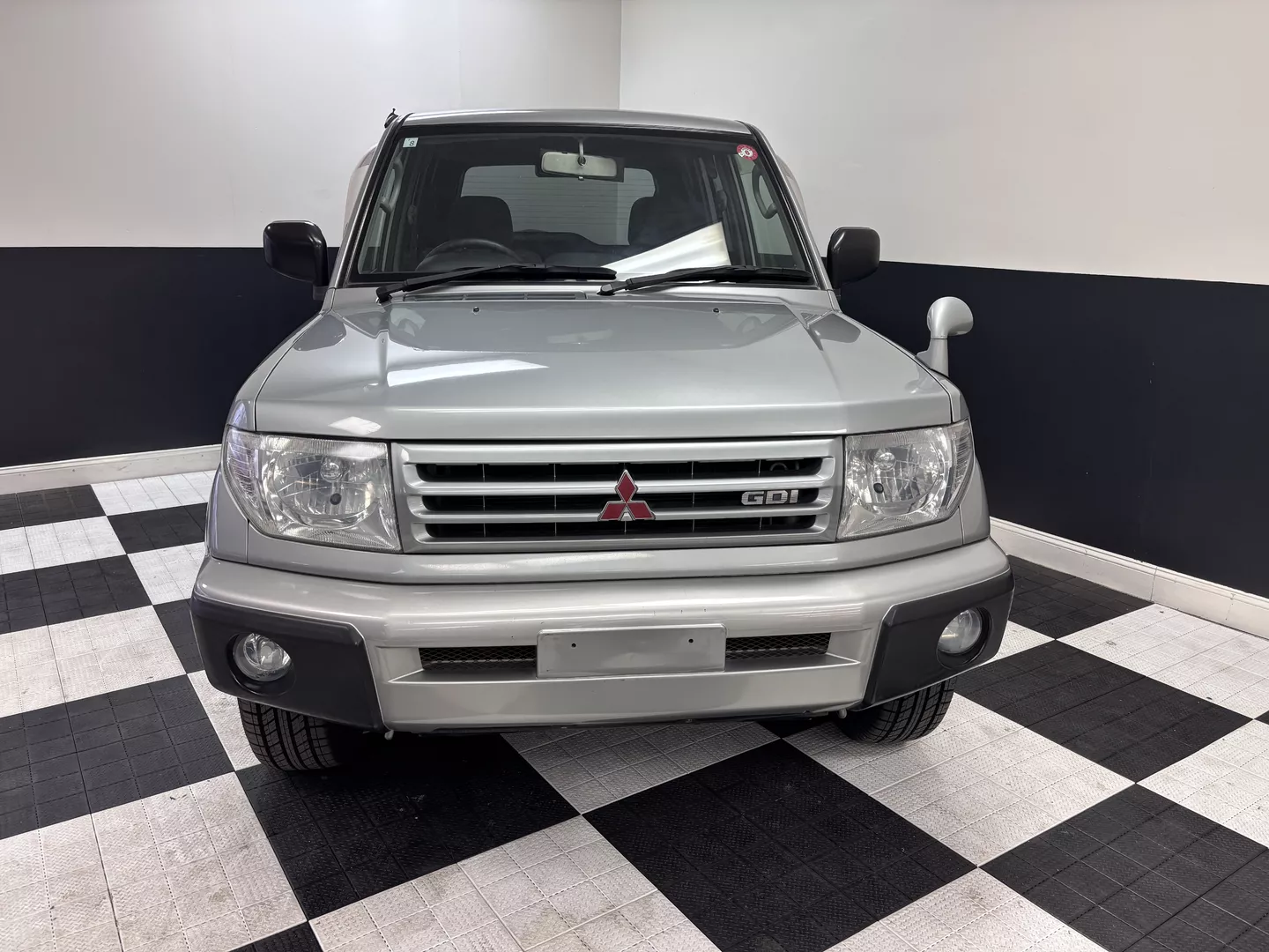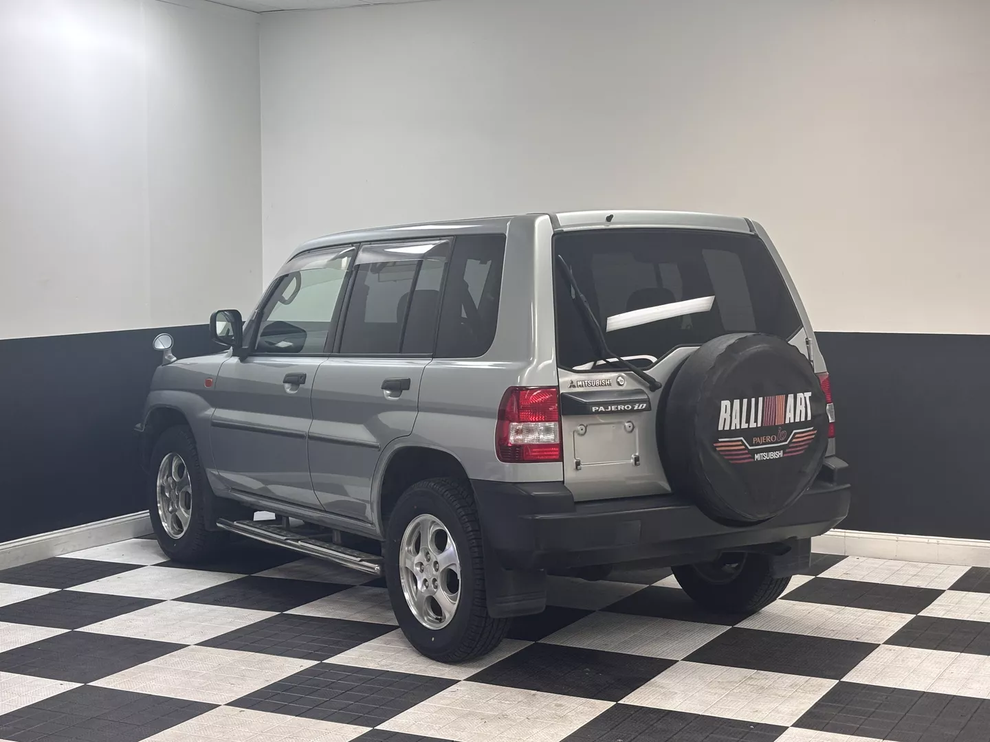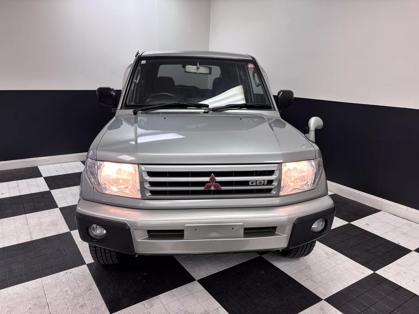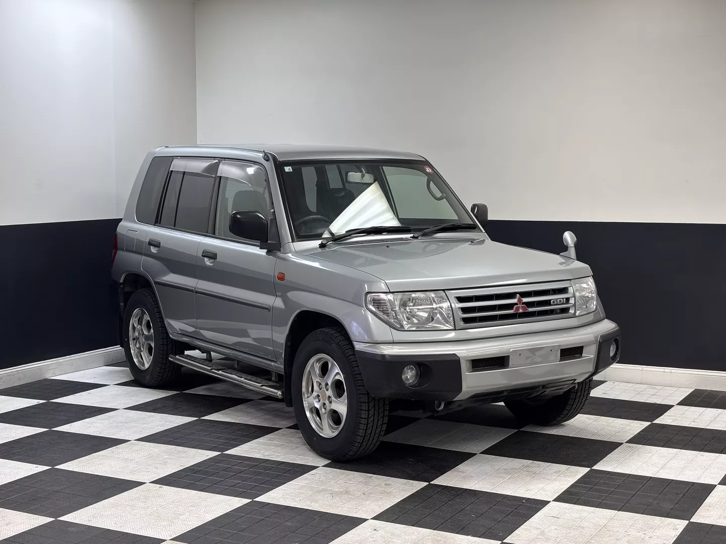 This 2000 Mitsubishi Pajero IO is equipped with a 1.8L 4G93 DOHC GDI engine mated to a 5-speed manual transmission. It has a 4x4 true transfer case with locking differential. The interior features an aftermarket Carrozzeria head unit, rear folding seats as well as rear storage compartment. Exterior features rear mounted spare, and a driver's side fender mirror.