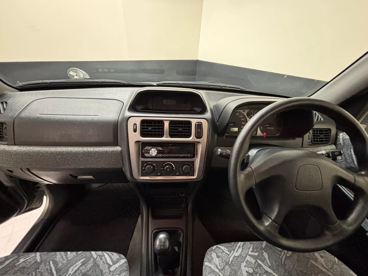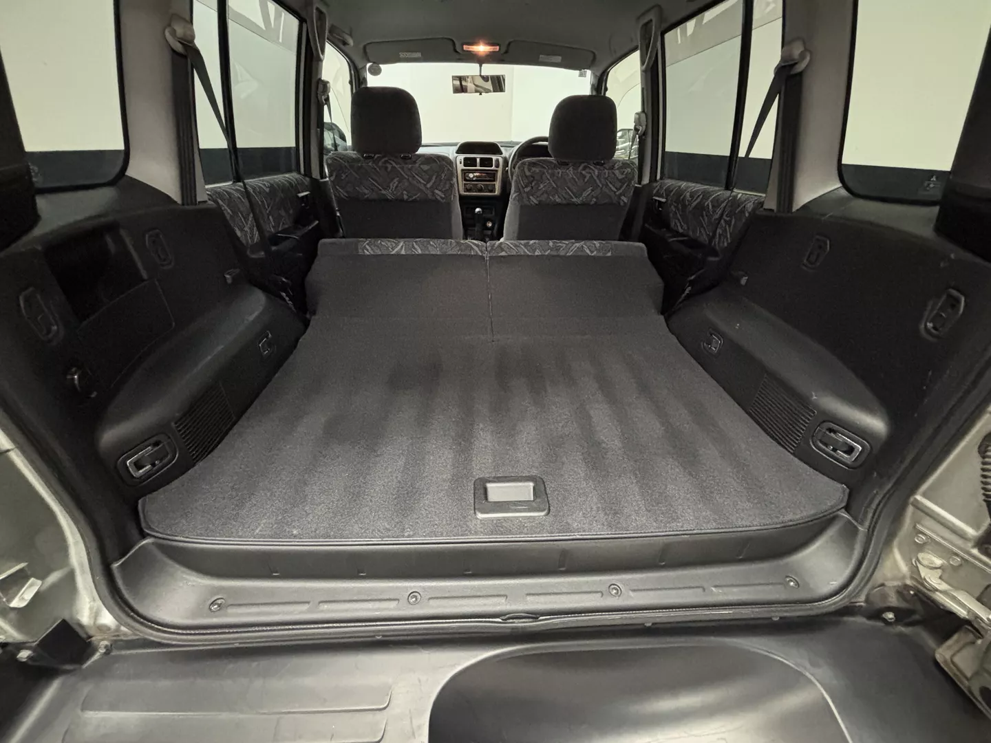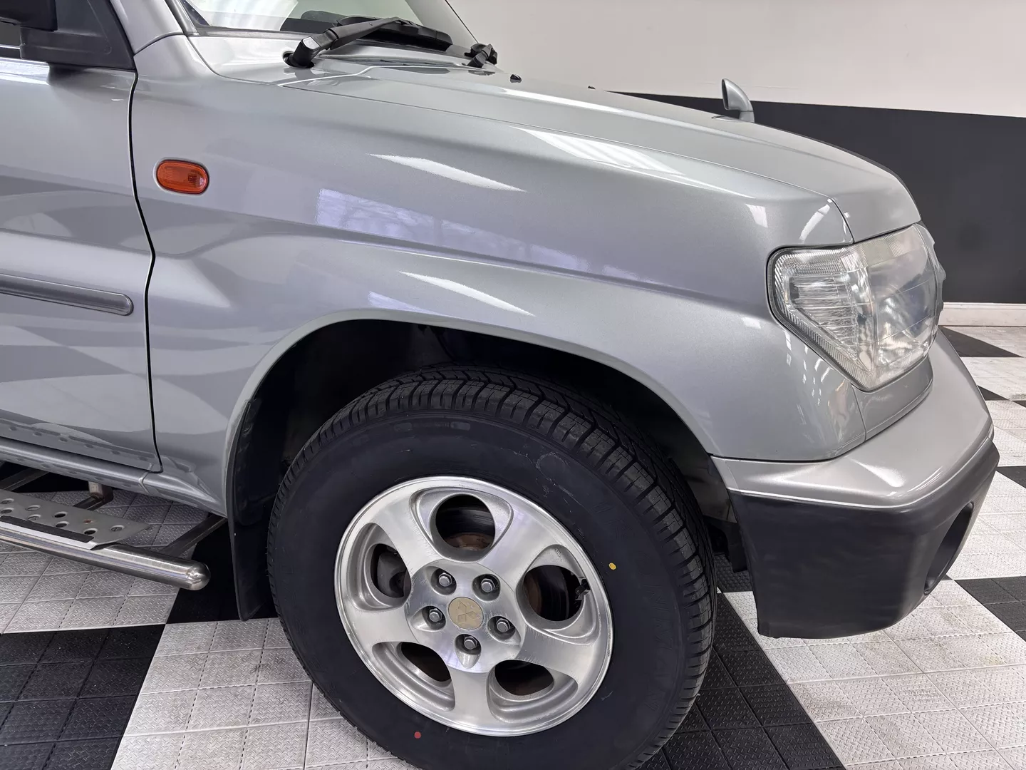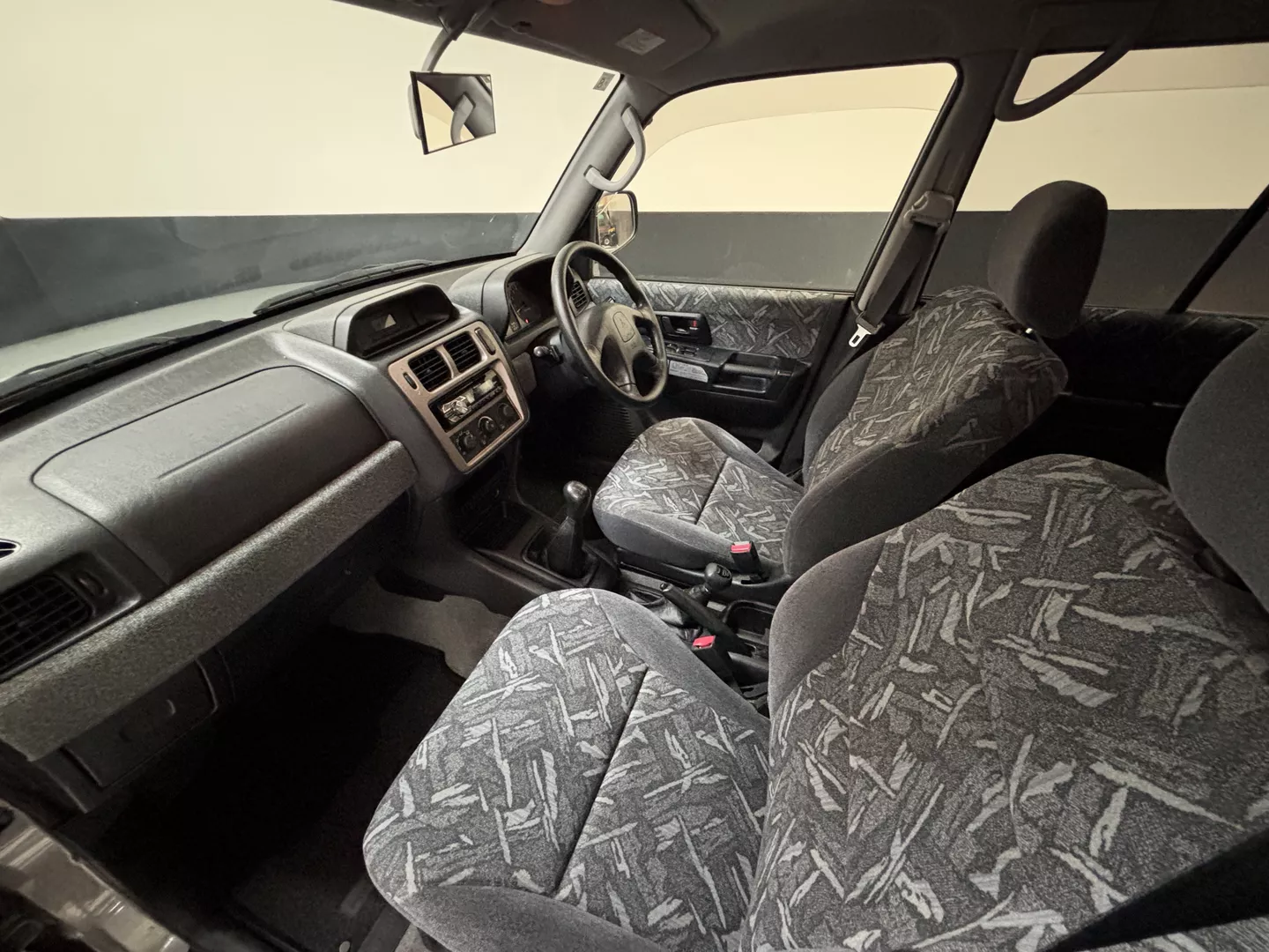 This 2000 Mitsubishi Pajero IO is equipped with a 1.8L 4G93 DOHC GDI engine mated to a 5-speed manual transmission. It has a 4x4 true transfer case with locking differential. The interior features an aftermarket Carrozzeria head unit, rear folding seats as well as rear storage compartment. Exterior features rear mounted spare, and a driver's side fender mirror.