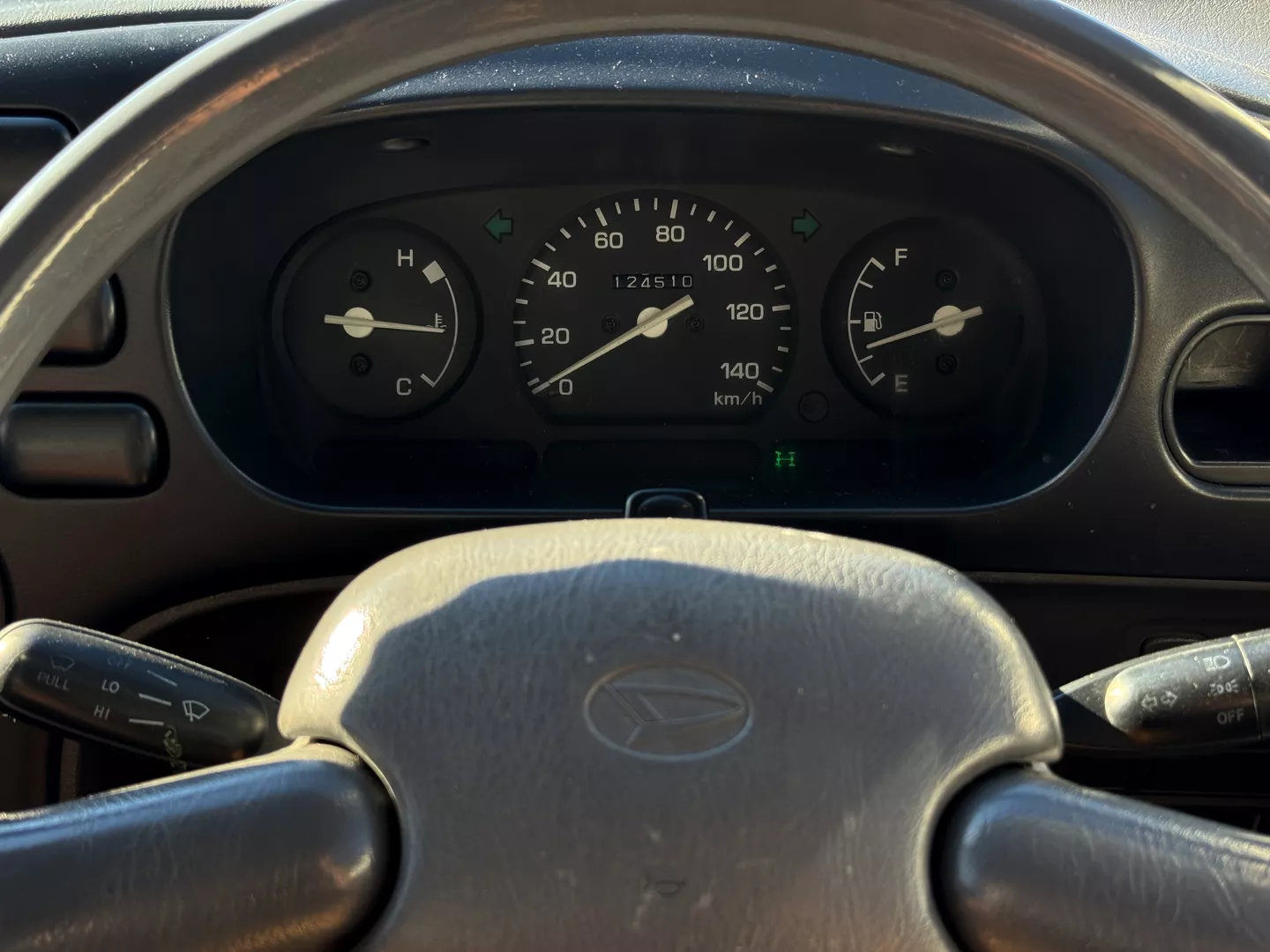 Mileage shows 124 510 km (≈ 77 350 mi), and the truck is rust-free, both underneath and in the bed.