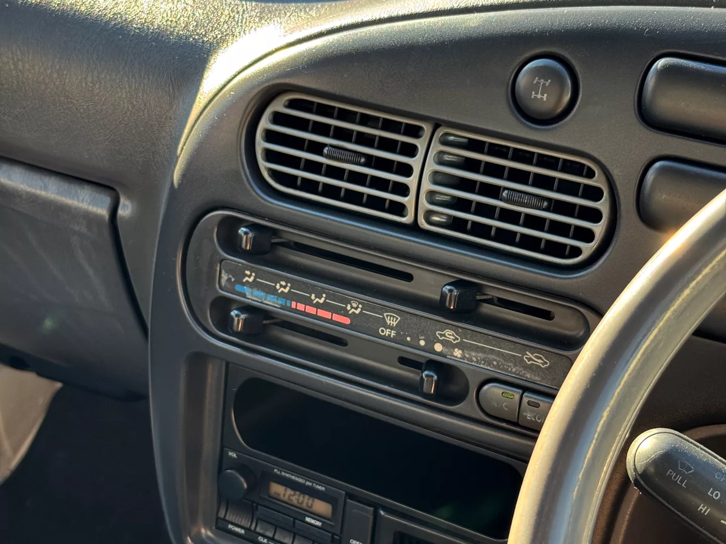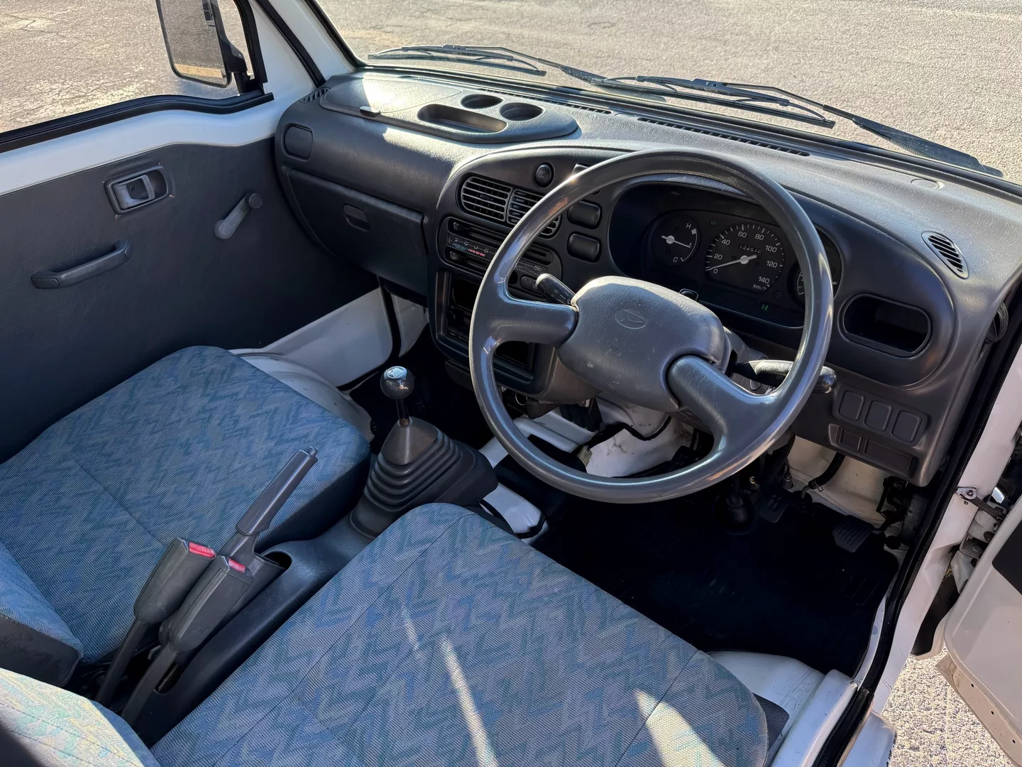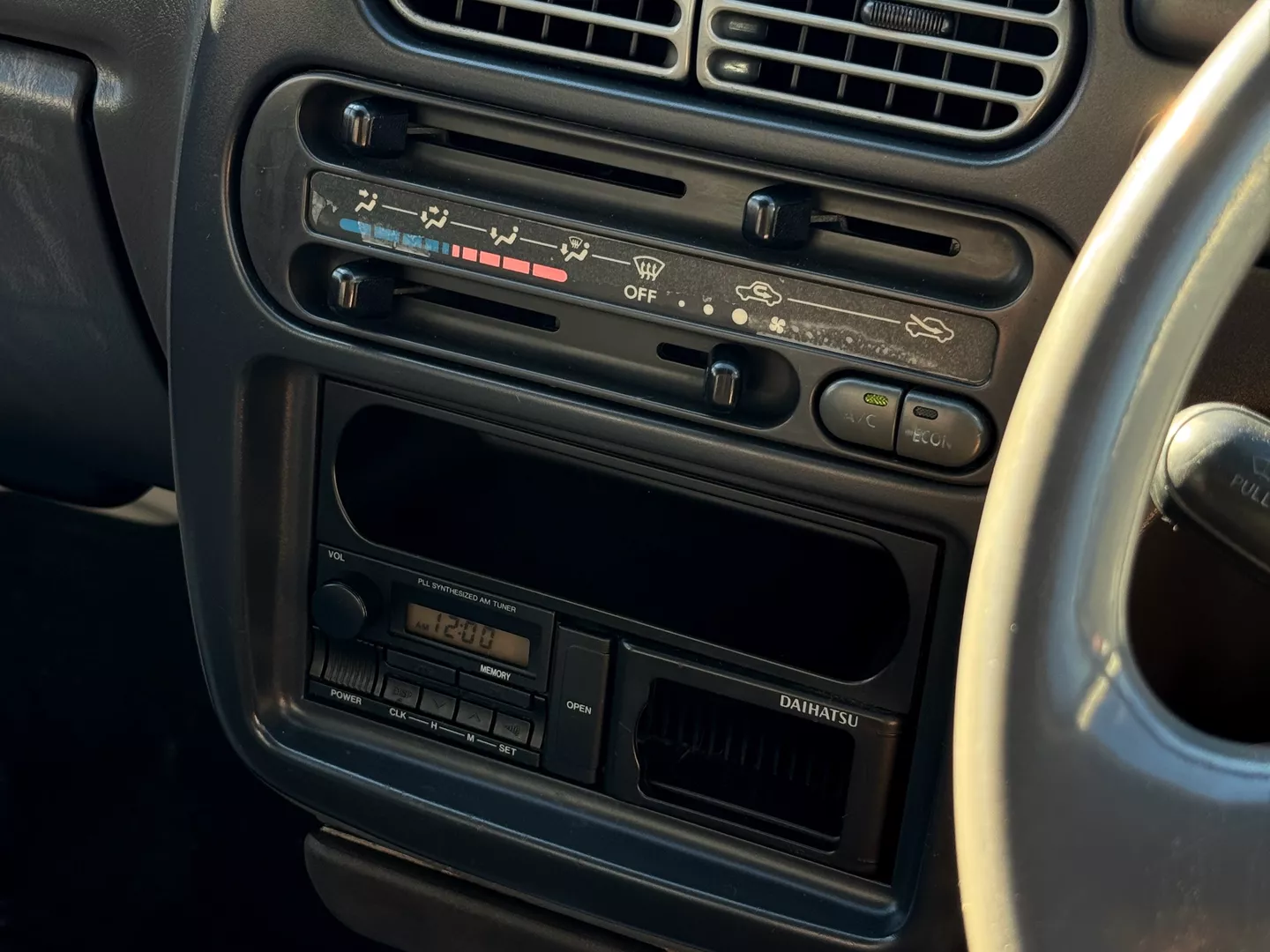 Inside, the cabin remains clean and functional, with a working A/C and even a dashboard cup holder, which is a small but rare feature on these older Hijets.