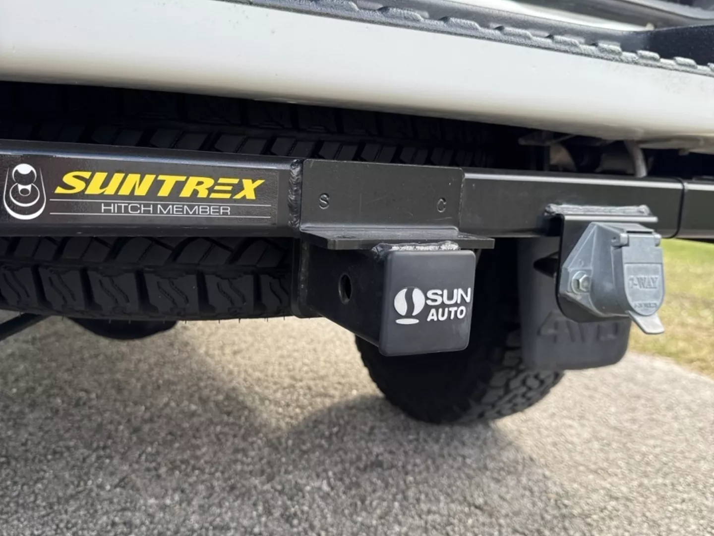 To complement its trail-ready stance, the Delica features a black powder-coated front guard paired with bold yellow fog lights for enhanced low-visibility performance during snowstorms, heavy rain, dust, or nighttime driving. Additional overlanding upgrades include black powder-coated side steps for easy cabin access and front under-guard bars for added protection from rocks and trail debris. Each enhancement adds genuine functionality while reinforcing the Delica’s rugged, adventure-focused styling. In the rear, a SUNTREX tow hitch with trailer adapter expands cargo-hauling capability, perfect for bike racks, small campers, or gear trailers for extended expeditions.