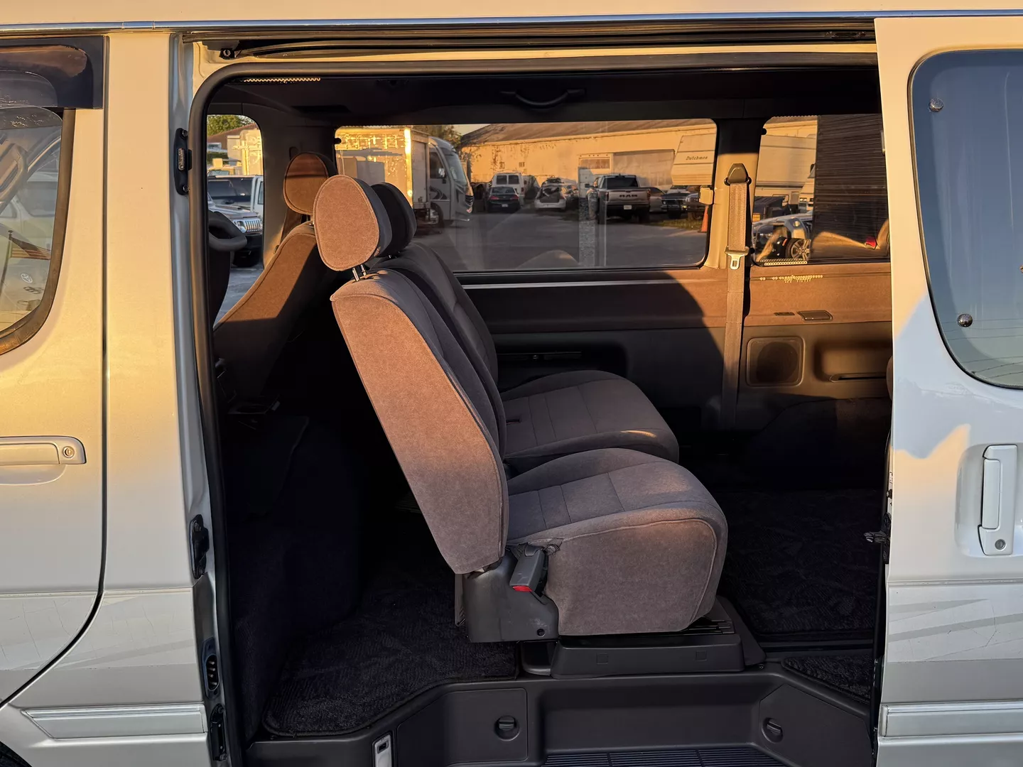 Inside, the HiAce offers impressive versatility. The second row swivels, the third row slides forward and back, and all seats fold into a full-size bed, making the van ideal for camping, travel, or large families.