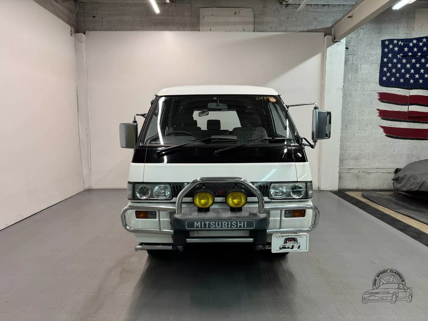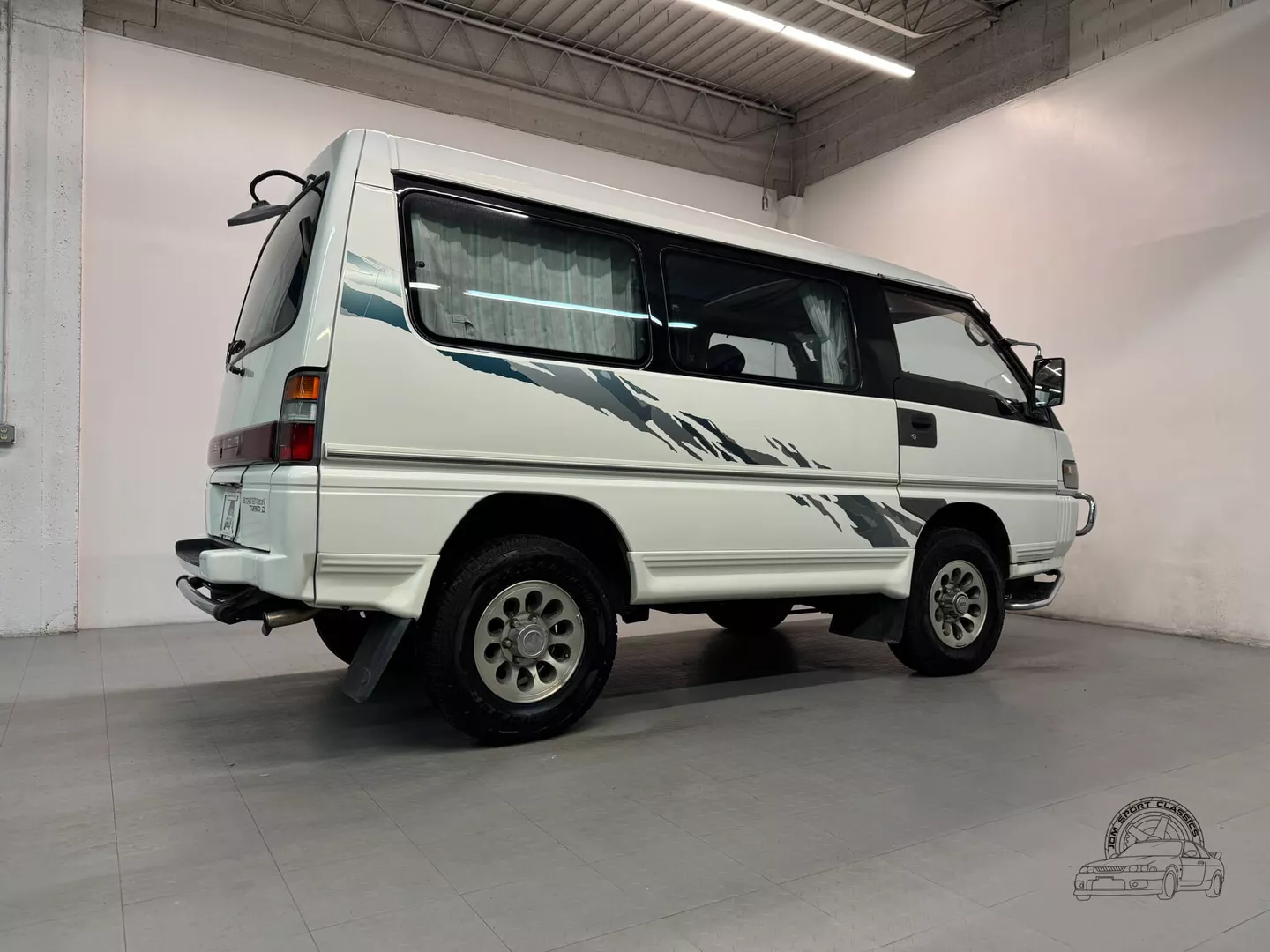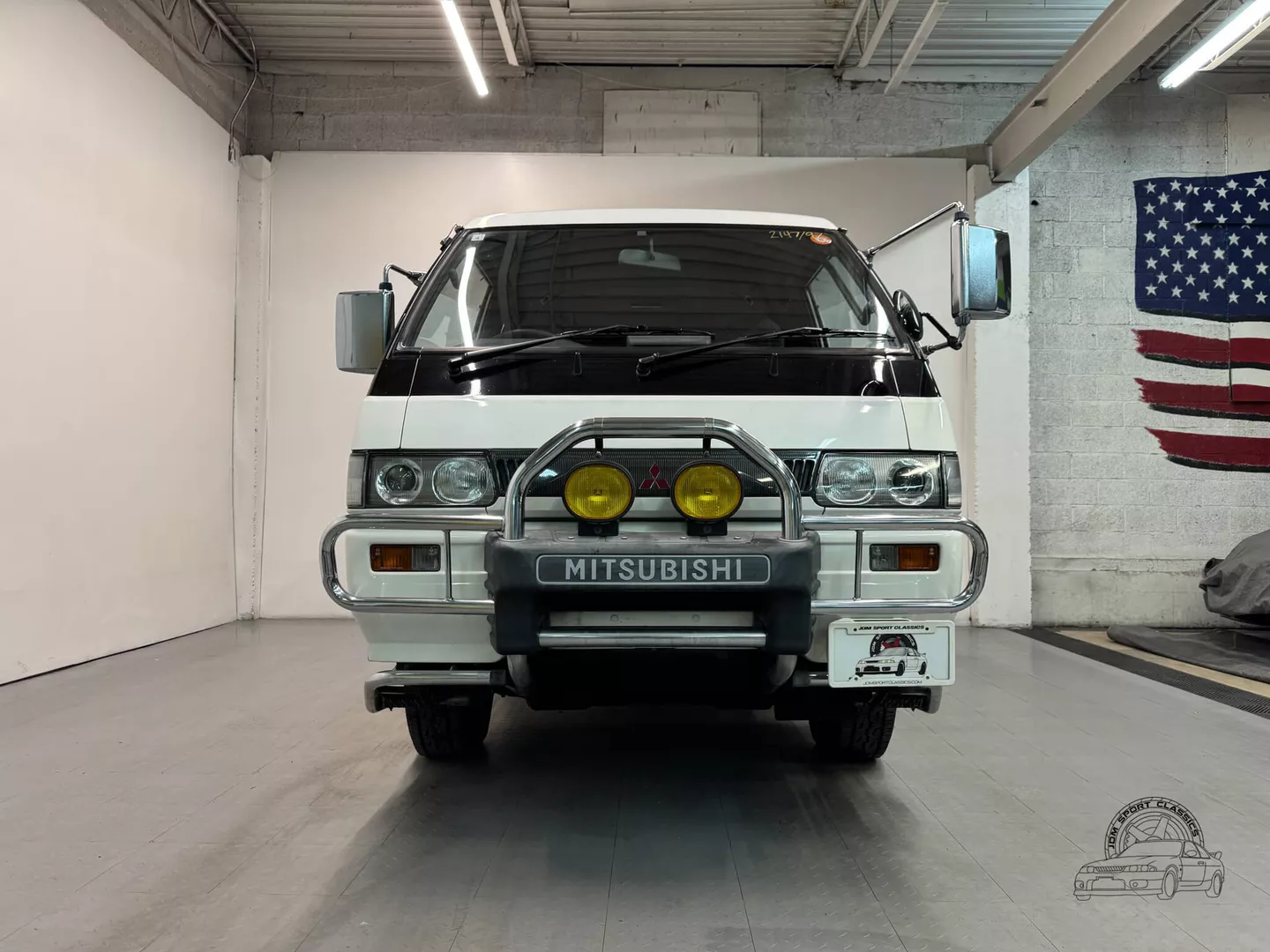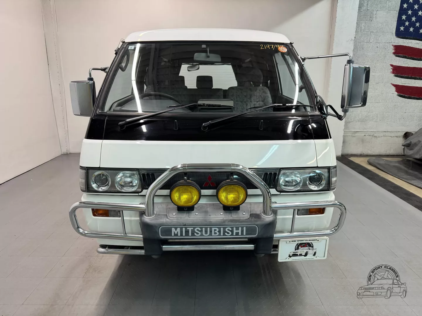 The L300 Delica is easily recognizable in a crowd, though, perhaps not intentionally. SUVs of the era were commonly found with the “boxy” styling that this example displays and consumers loved it. This example is finished in Color Code W09 Summit White, with the Active World decals still in good shape. Gloss black window surrounds offer contrast around the cabin, furthering the look of this already stand-out van. Found with the factory optioned “Monsoon Guards”, chrome push bar with yellow fog lights, side steps, rear parking mirror, and door handle Jewelry guards, this example was certainly well optioned.