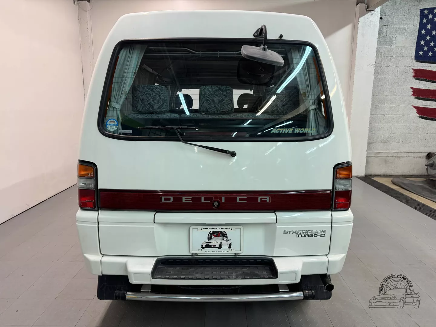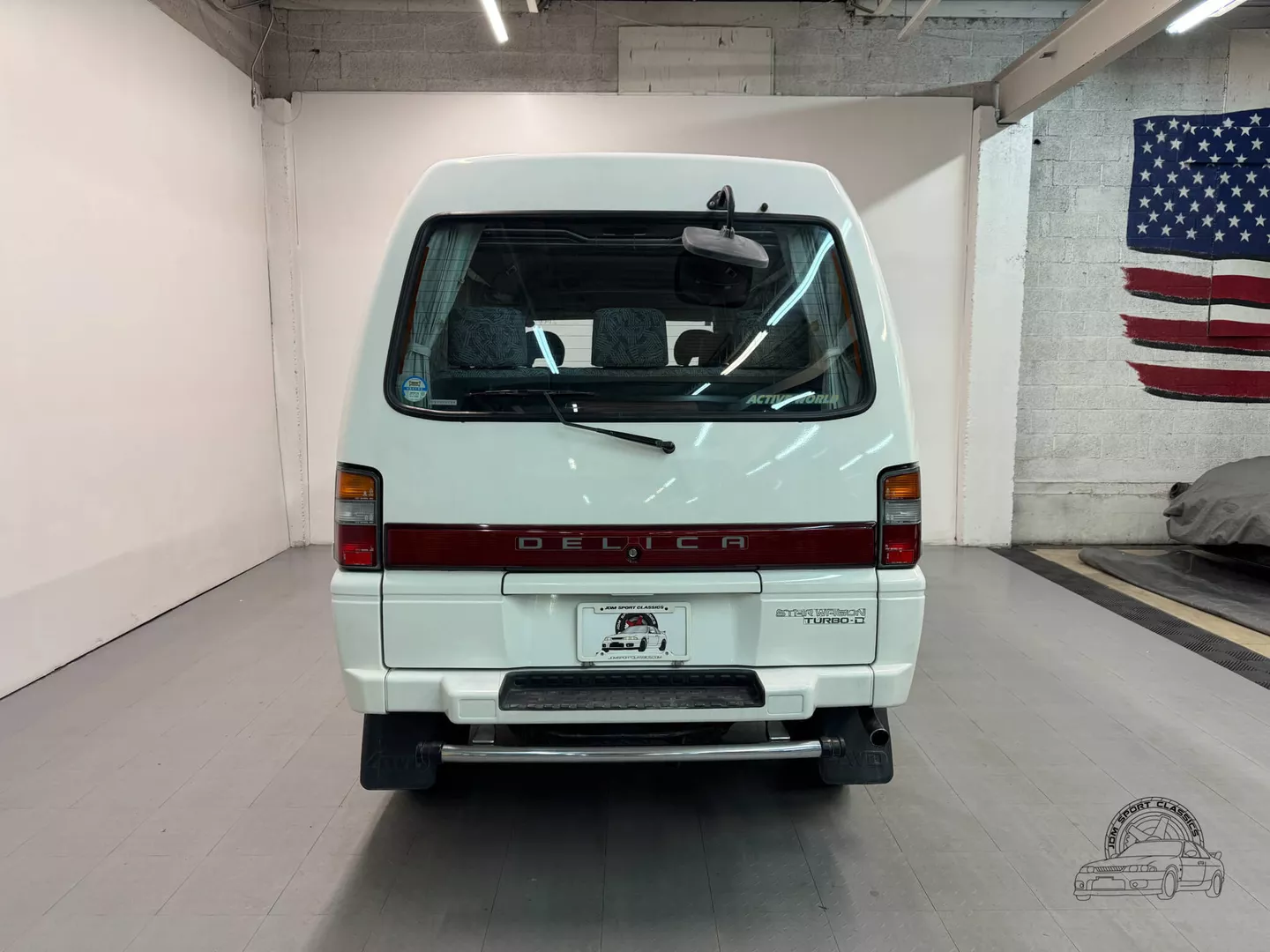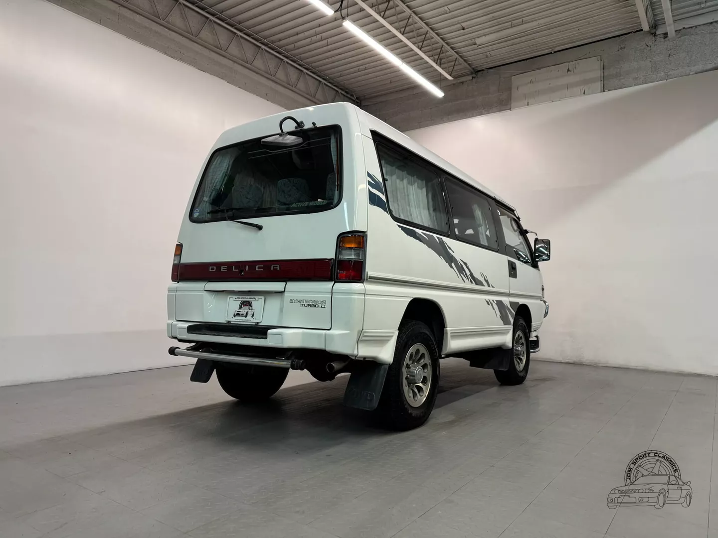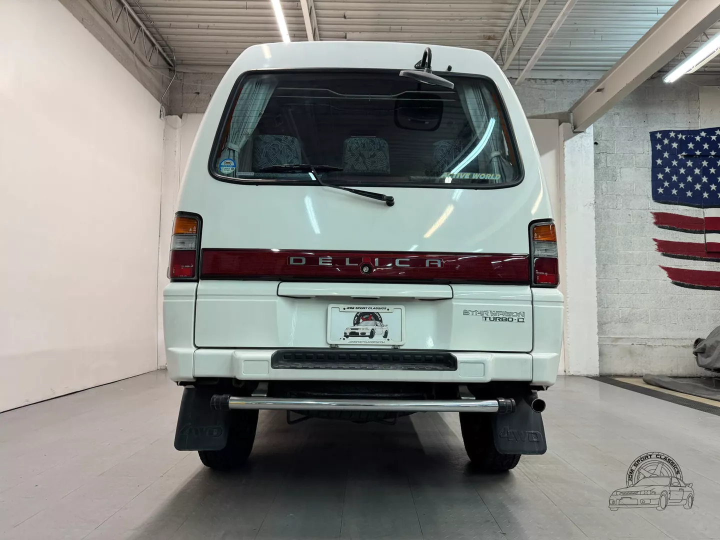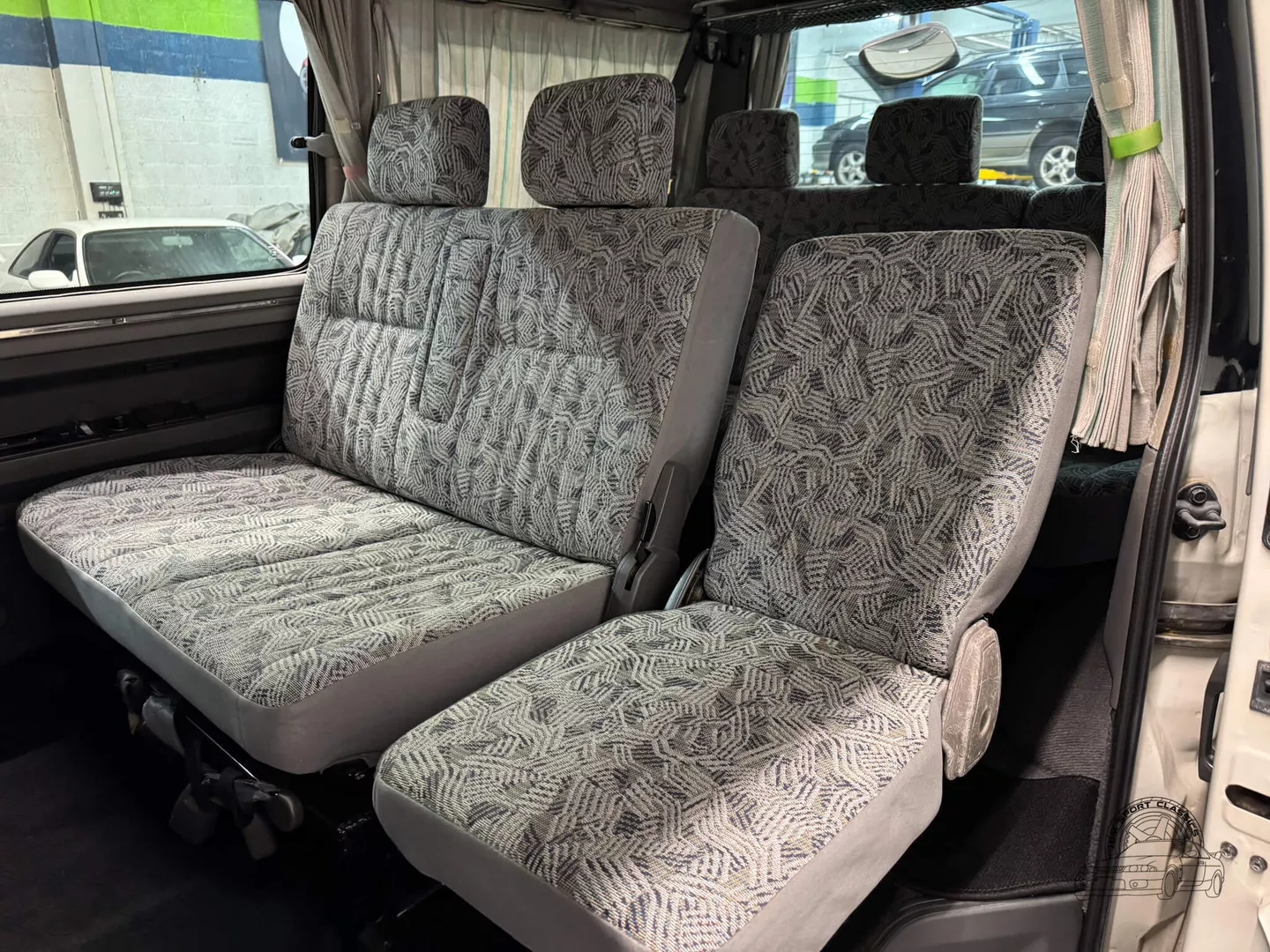 The L300 Delica is easily recognizable in a crowd, though, perhaps not intentionally. SUVs of the era were commonly found with the “boxy” styling that this example displays and consumers loved it. This example is finished in Color Code W09 Summit White, with the Active World decals still in good shape. Gloss black window surrounds offer contrast around the cabin, furthering the look of this already stand-out van. Found with the factory optioned “Monsoon Guards”, chrome push bar with yellow fog lights, side steps, rear parking mirror, and door handle Jewelry guards, this example was certainly well optioned.