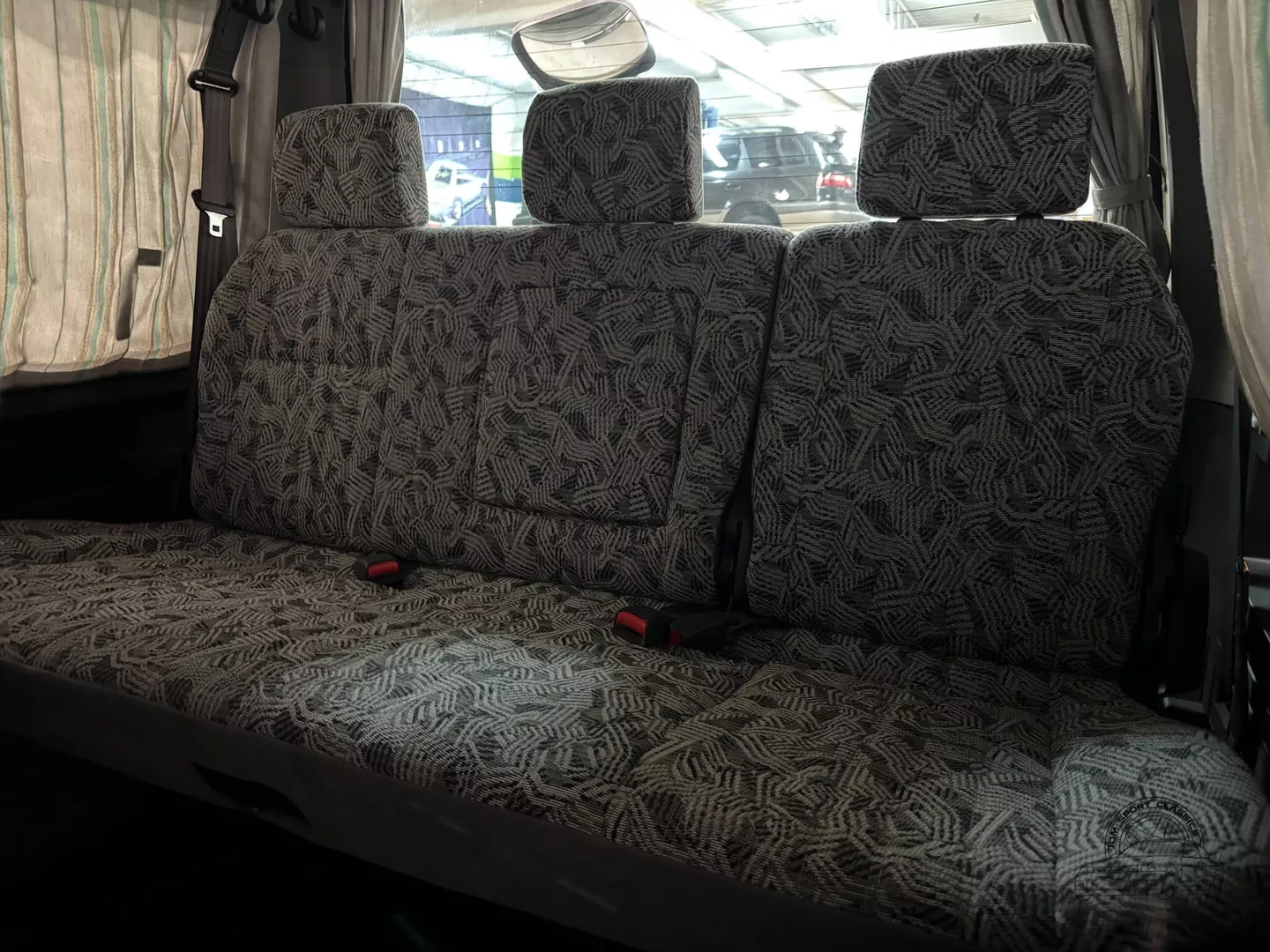 Stepping into the cabin, you are immediately greeted with cloth patterned seats that are unique and comfortable. Seating for 8 passengers allows road trips with large groups, or can be arranged to maximize cargo space. The back rest of the middle row can be flipped, allowing passengers to face each other while driving. The two rear benches can also be flattened into a bed, largely giving the Delica its place in the adventure van scene. Features include power windows, power door locks, rear curtains, hot heat, cold A/C, front and rear climate control, front cupholders, and dashboard mounted thermometer, inclinometer, and pitch/roll gauges.