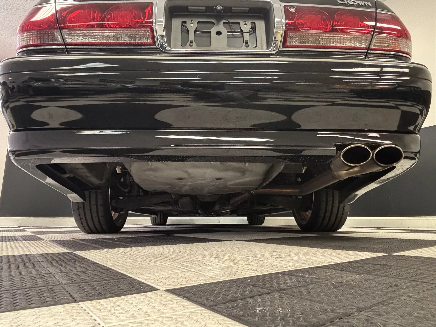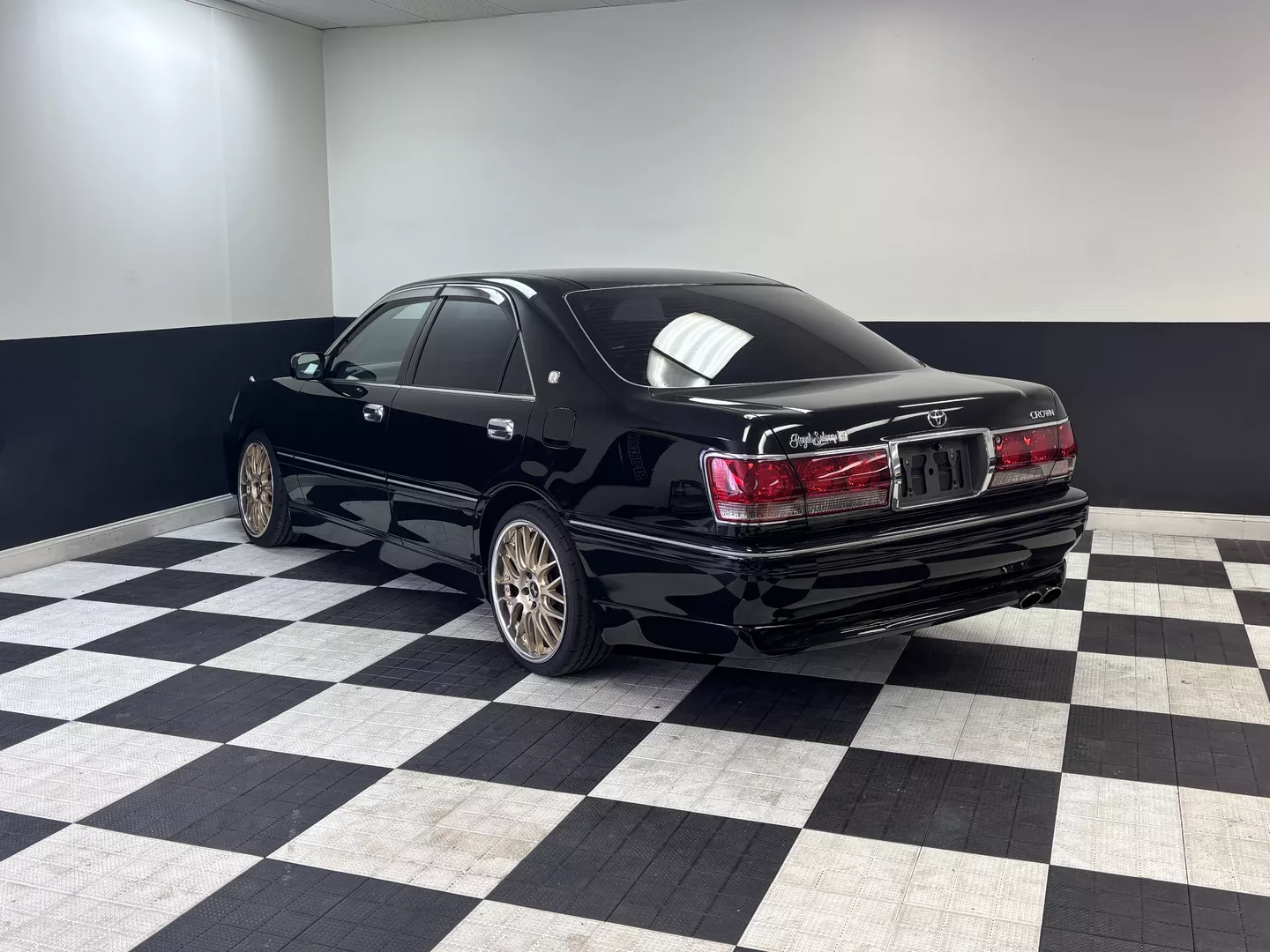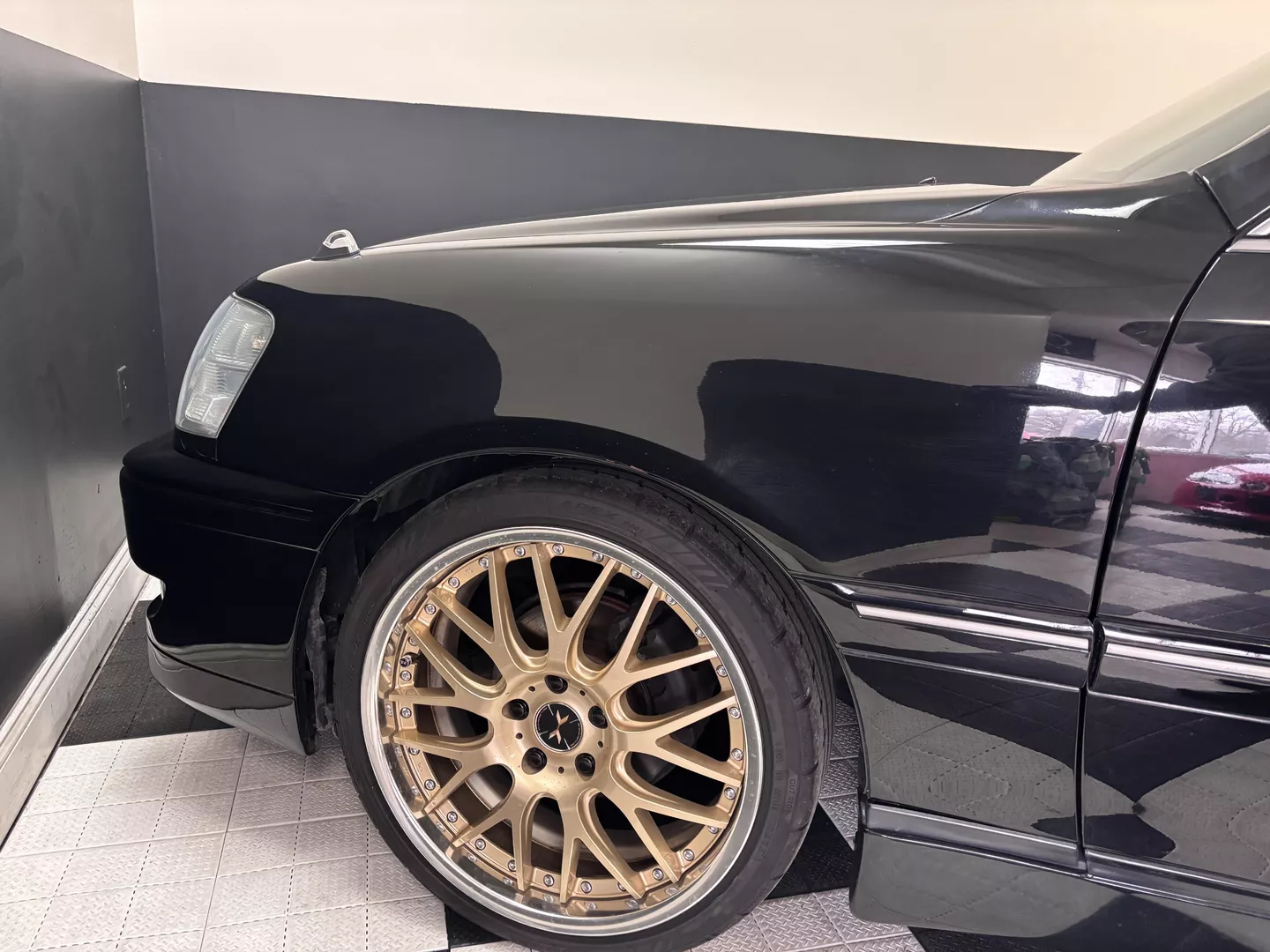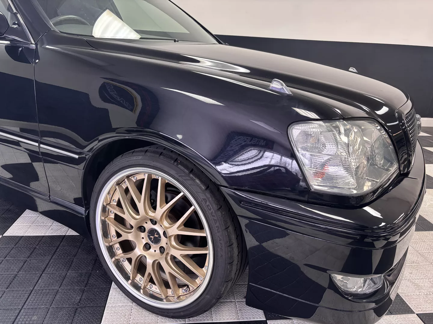 This 2000 Toyota Crown is fitted with a 2JZ-FSE I6 engine backed by a 5-speed automatic transmission. It is painted in 202 Toyota Onyx Black. It has aftermarket coil overs and has been upgraded with 19" Weds Maverick Samurai gold finish wheels while retaining all other factory equipment. It has aftermarket exhaust as well as aftermarket body valences.