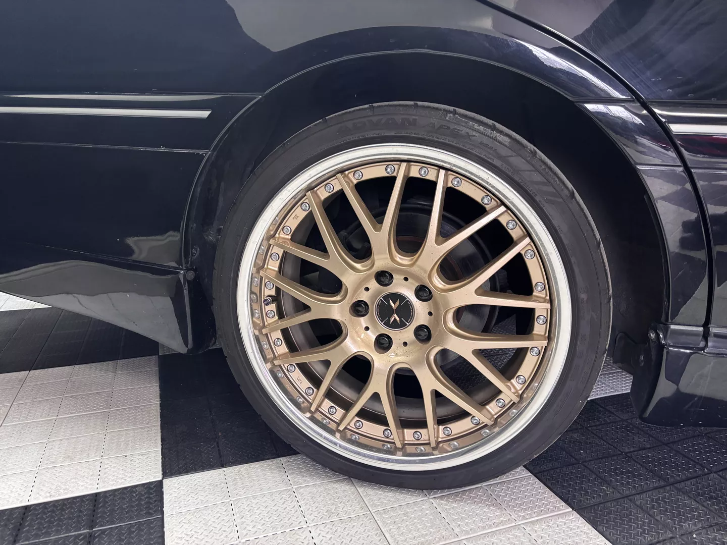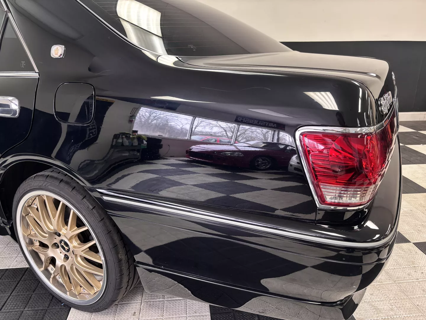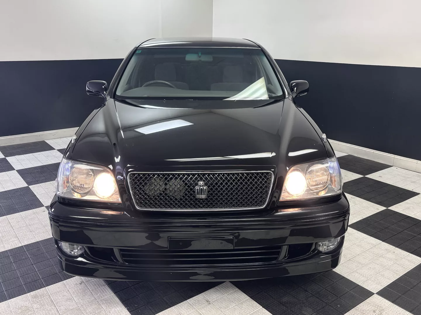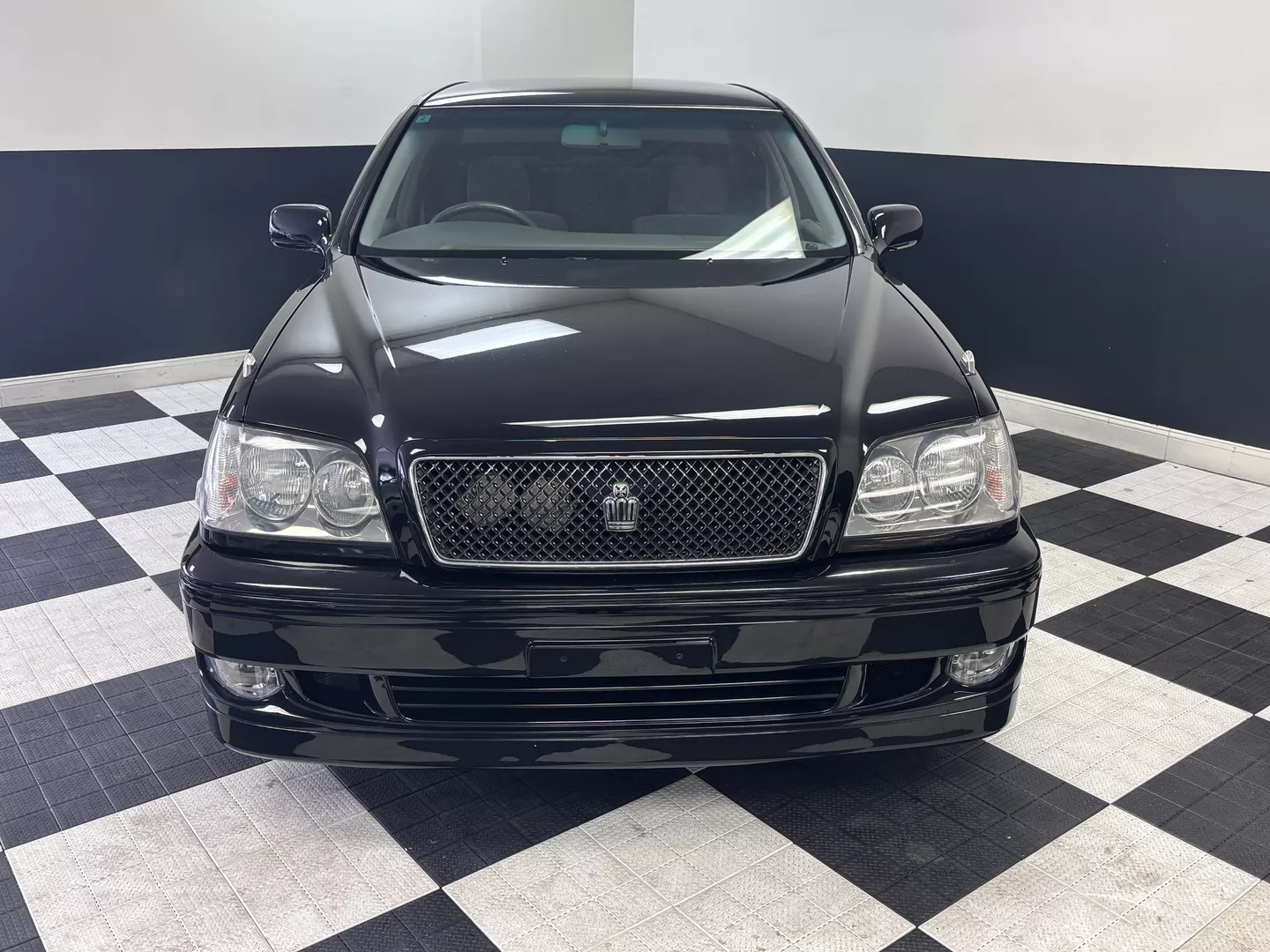 This 2000 Toyota Crown is fitted with a 2JZ-FSE I6 engine backed by a 5-speed automatic transmission. It is painted in 202 Toyota Onyx Black. It has aftermarket coil overs and has been upgraded with 19" Weds Maverick Samurai gold finish wheels while retaining all other factory equipment. It has aftermarket exhaust as well as aftermarket body valences.