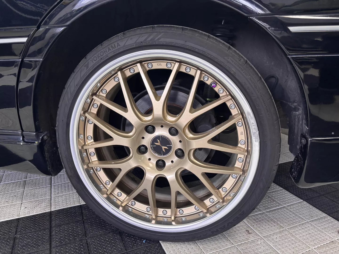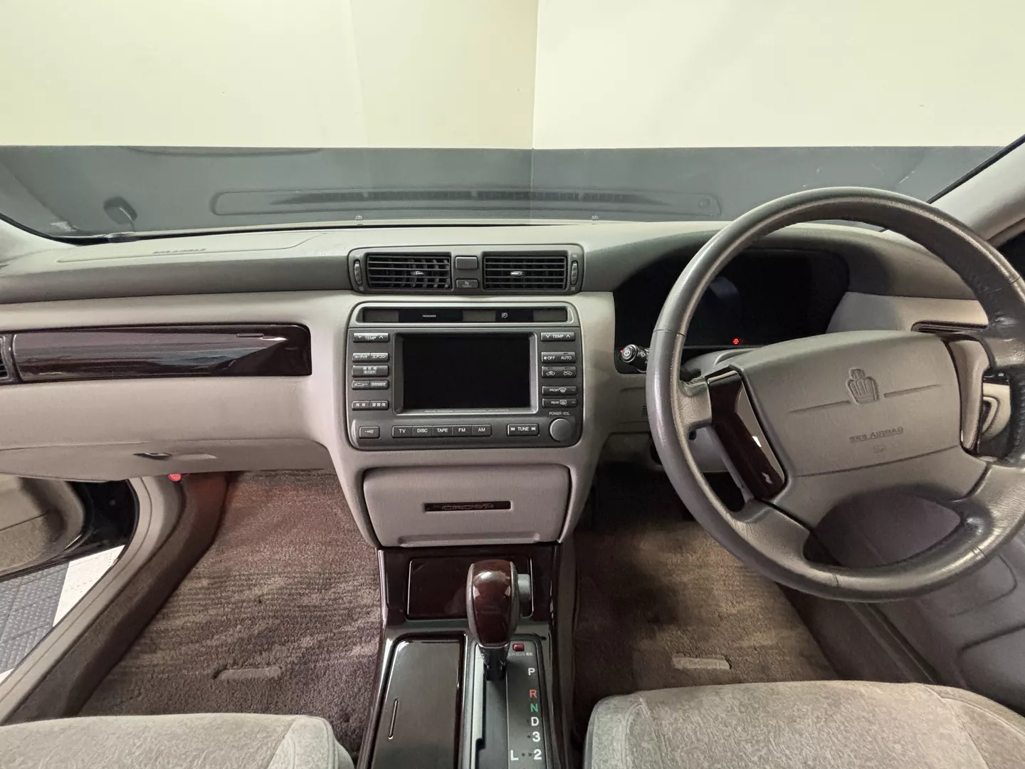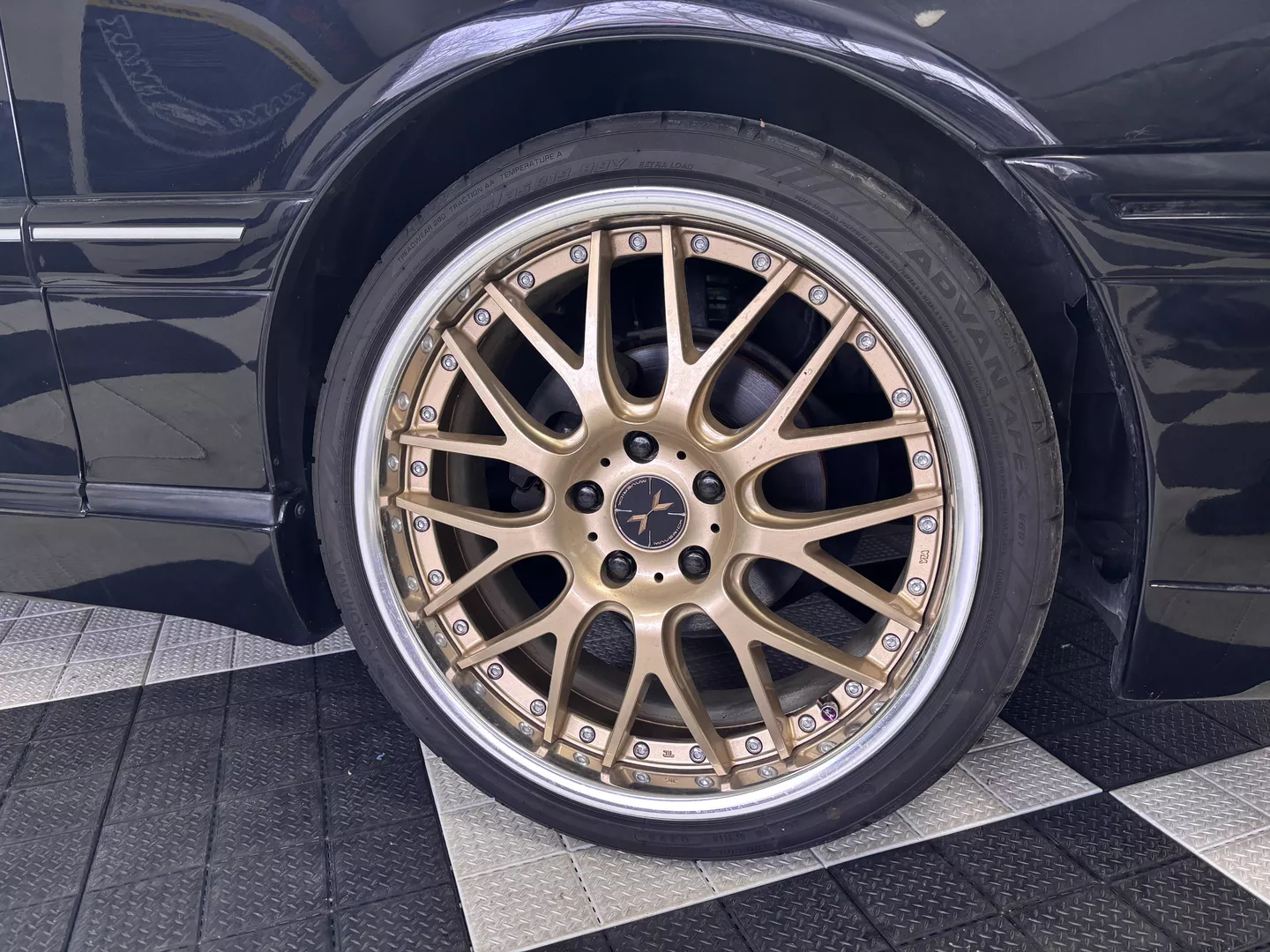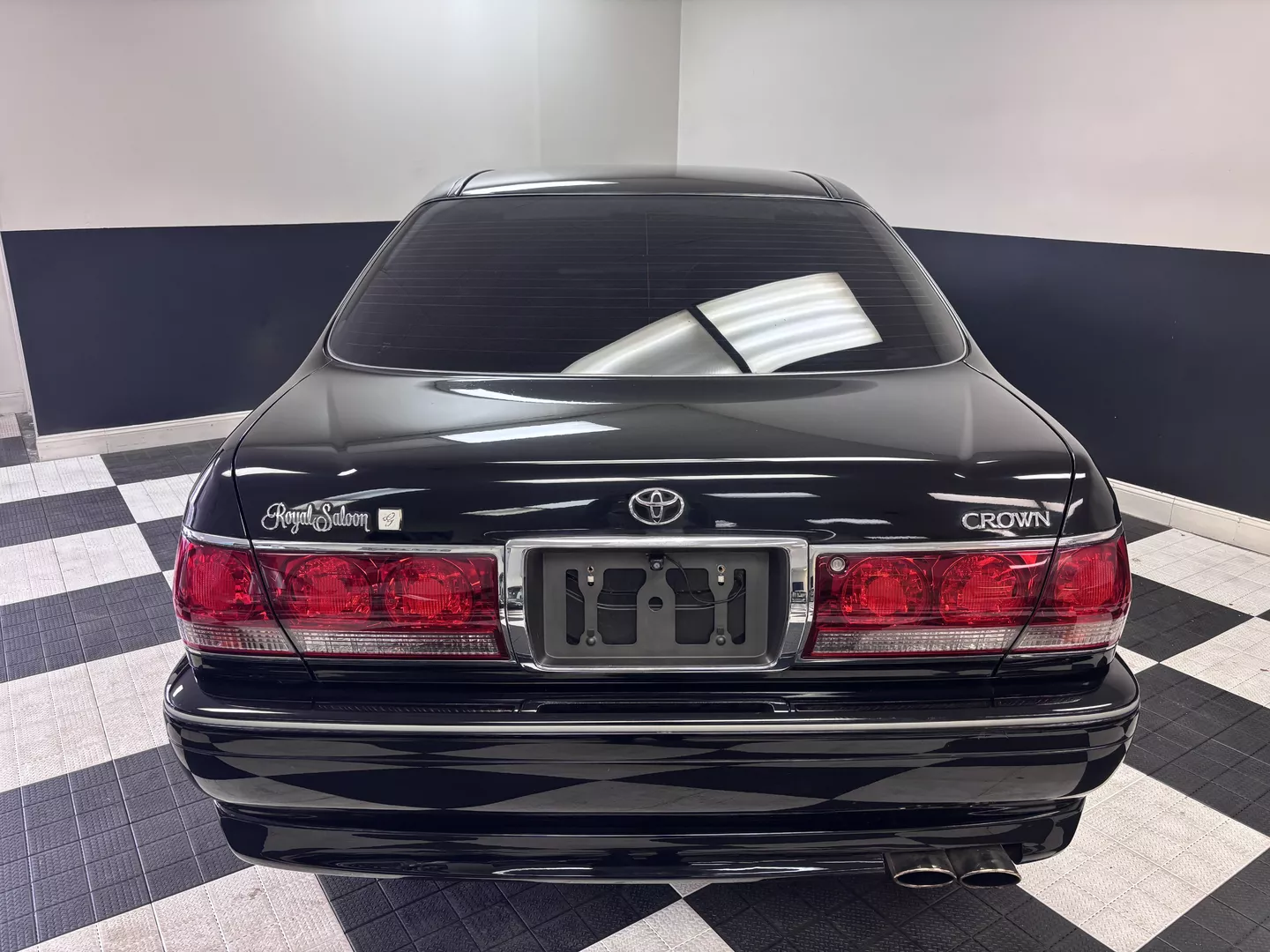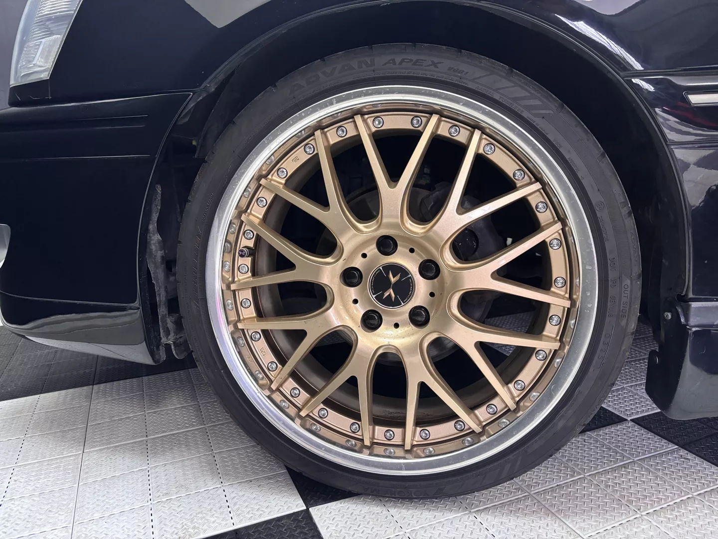 This 2000 Toyota Crown is fitted with a 2JZ-FSE I6 engine backed by a 5-speed automatic transmission. It is painted in 202 Toyota Onyx Black. It has aftermarket coil overs and has been upgraded with 19" Weds Maverick Samurai gold finish wheels while retaining all other factory equipment. It has aftermarket exhaust as well as aftermarket body valences.