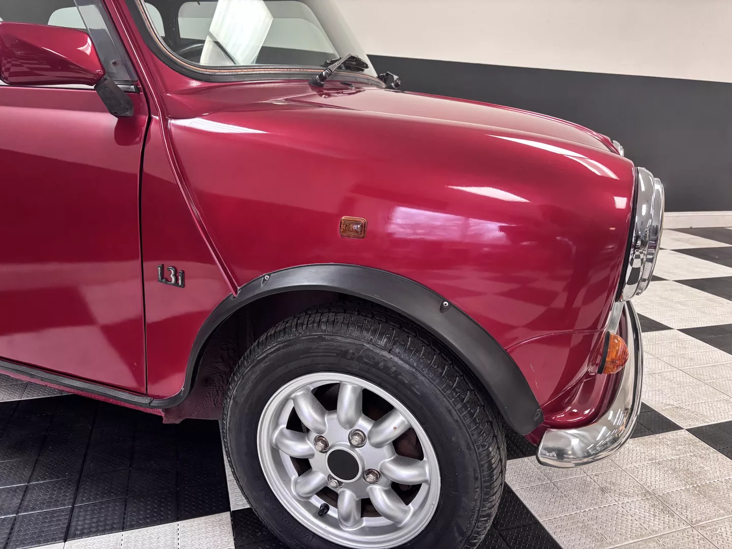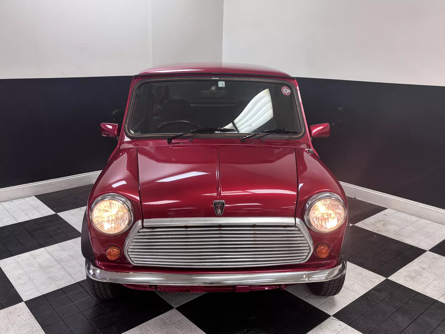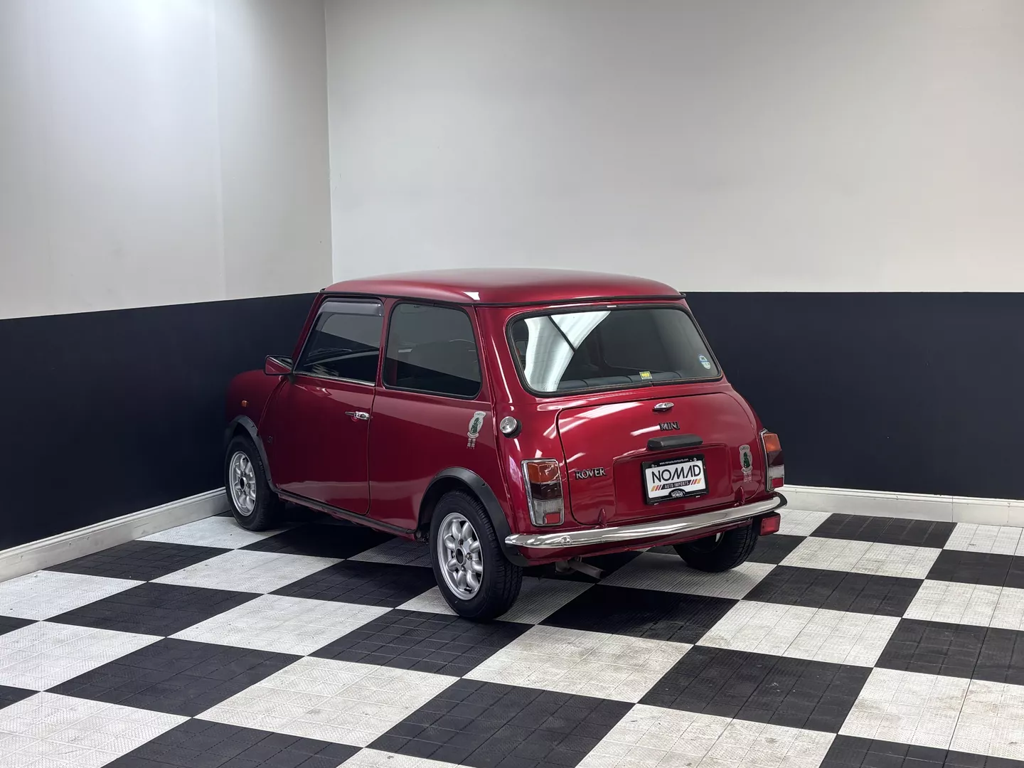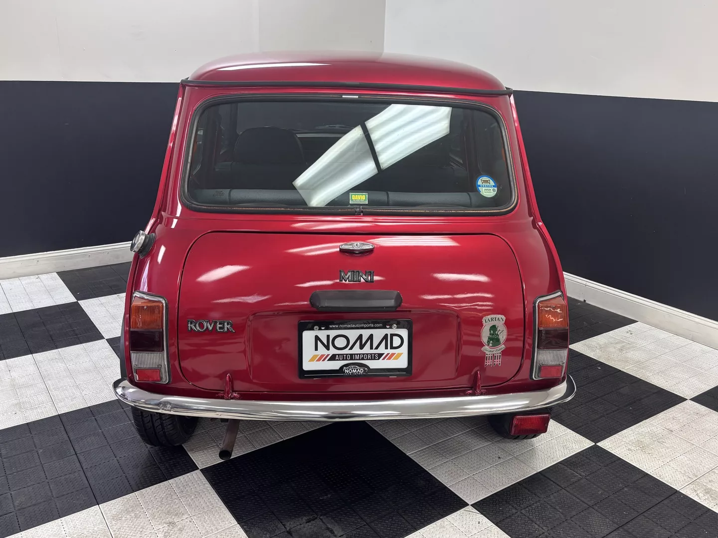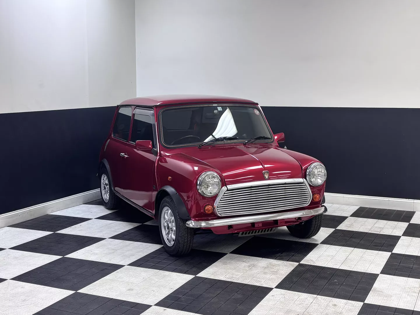 This 1996 Rover Mini Tartan is painted metallic burgundy with a matching roof and Green & Red Tartan interior with red seatbelts. The car interior features an aftermarket head unit, factory red and green tartan door cards as well as factory tartan seats. This Mini has a 1.3-liter 4-cylinder fuel-injected engine with air conditioning. The engine is backed by a 4-speed manual transmission.