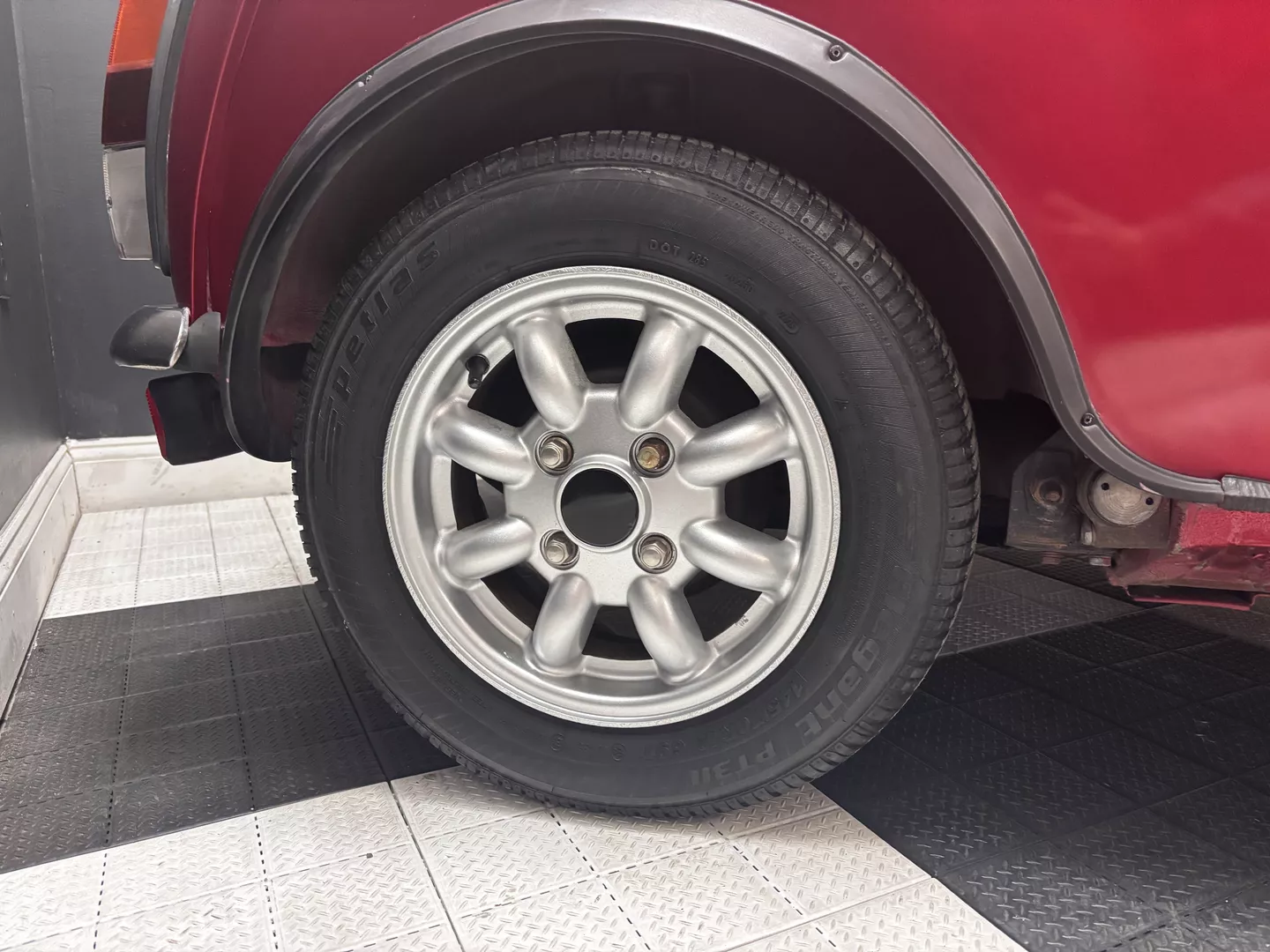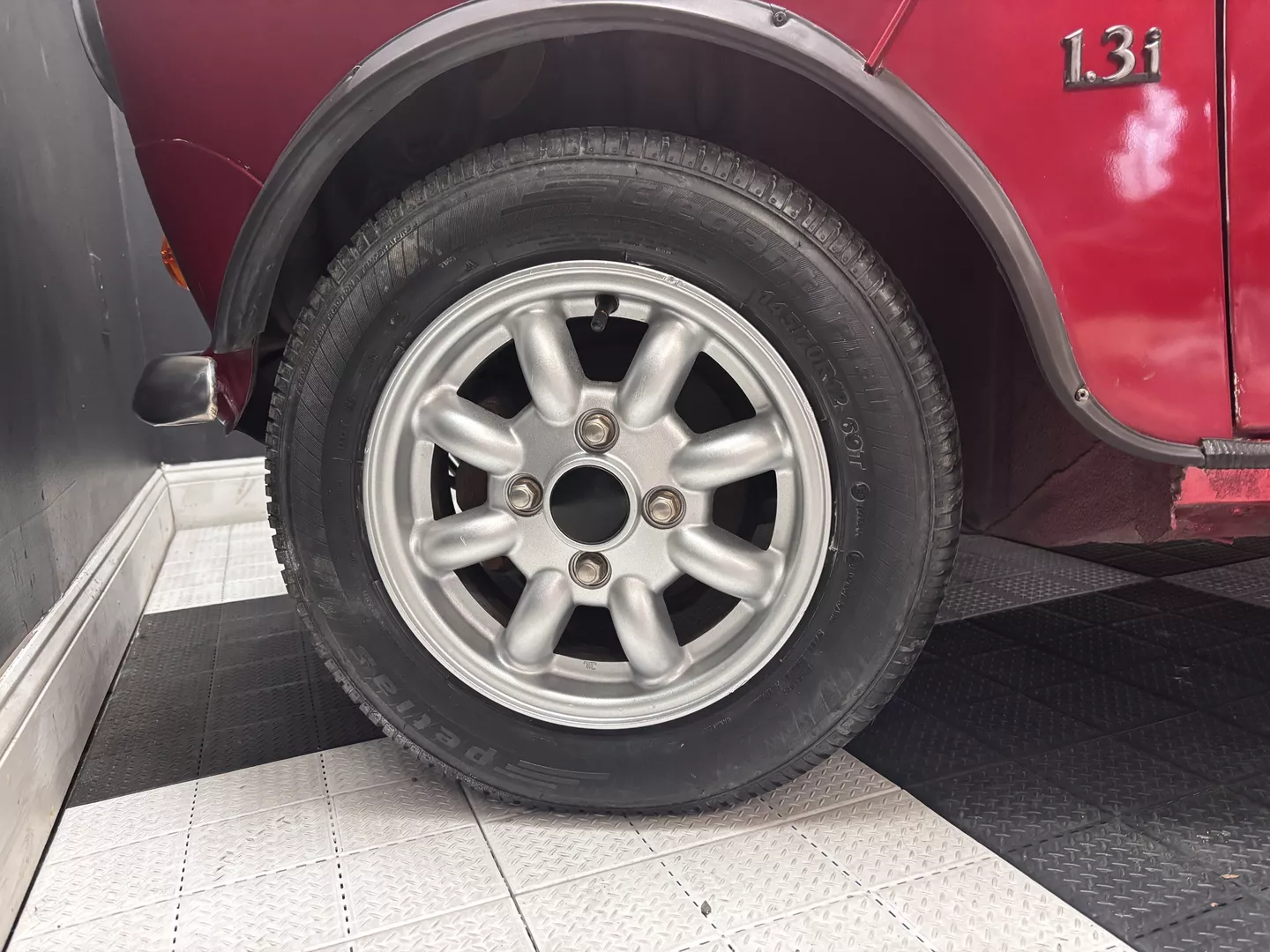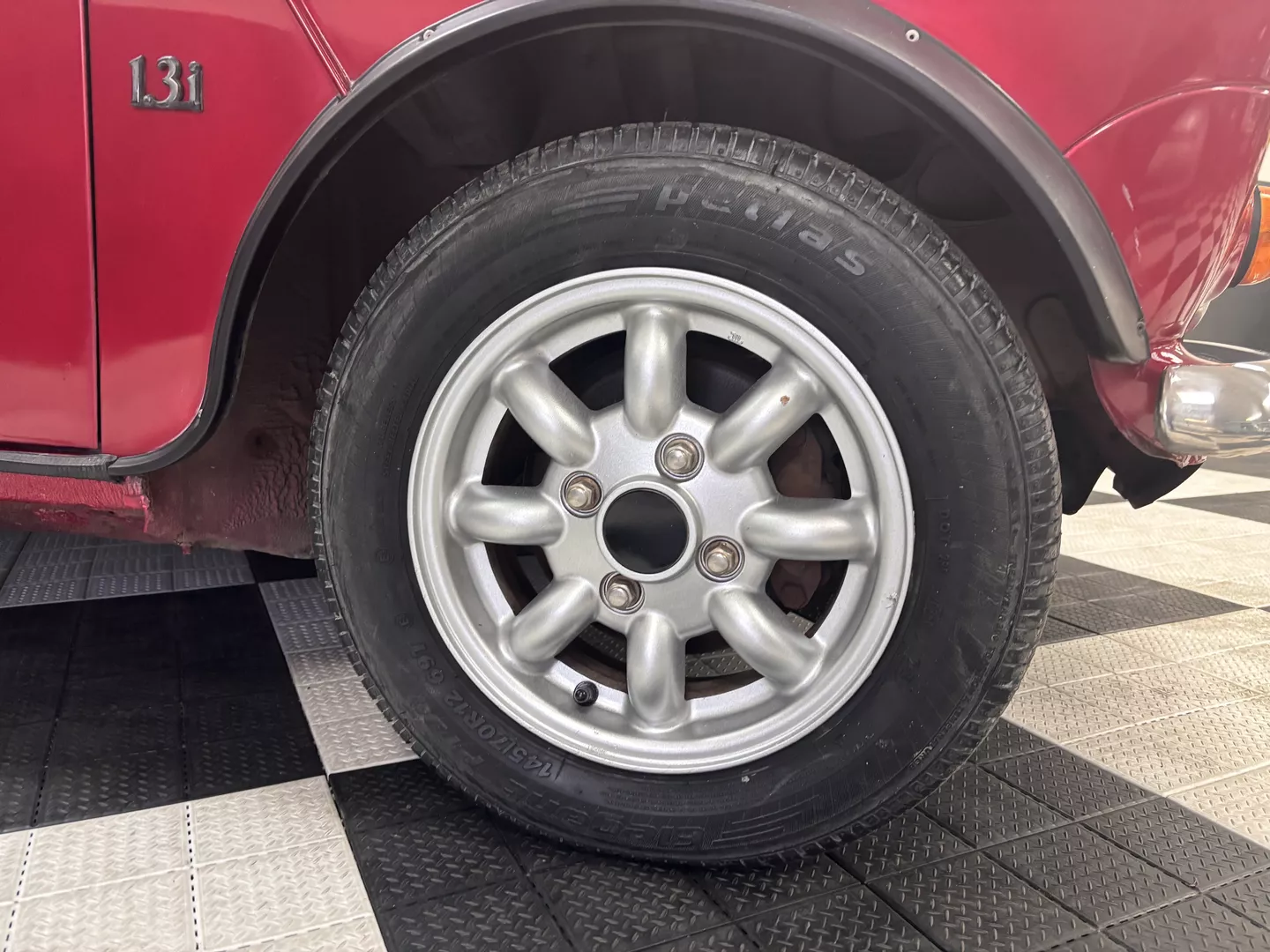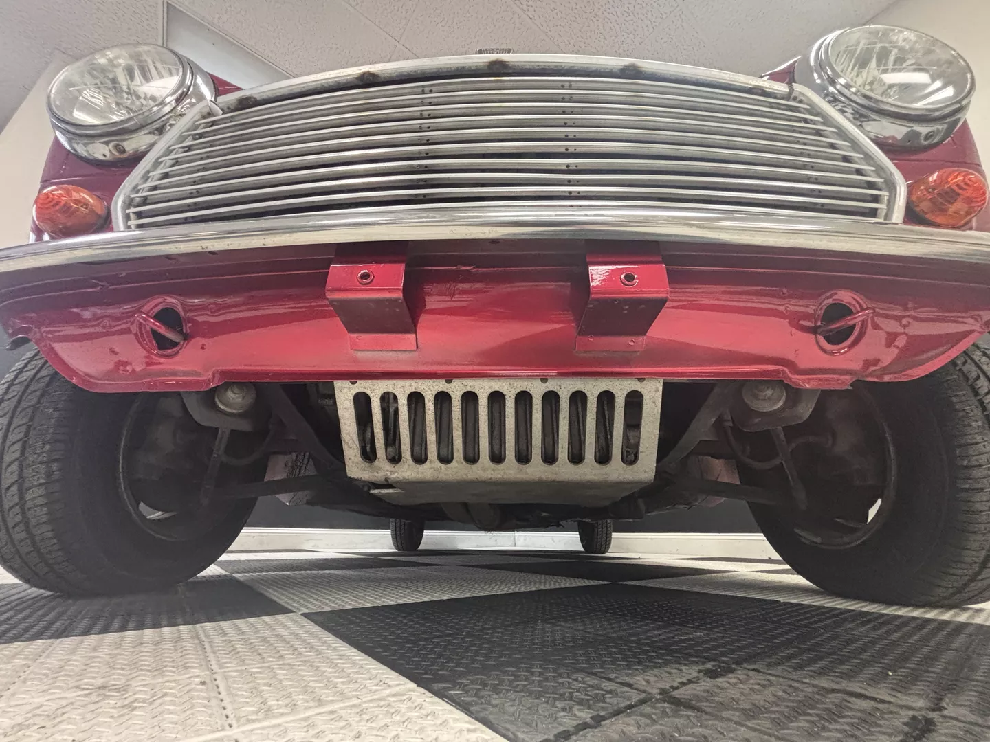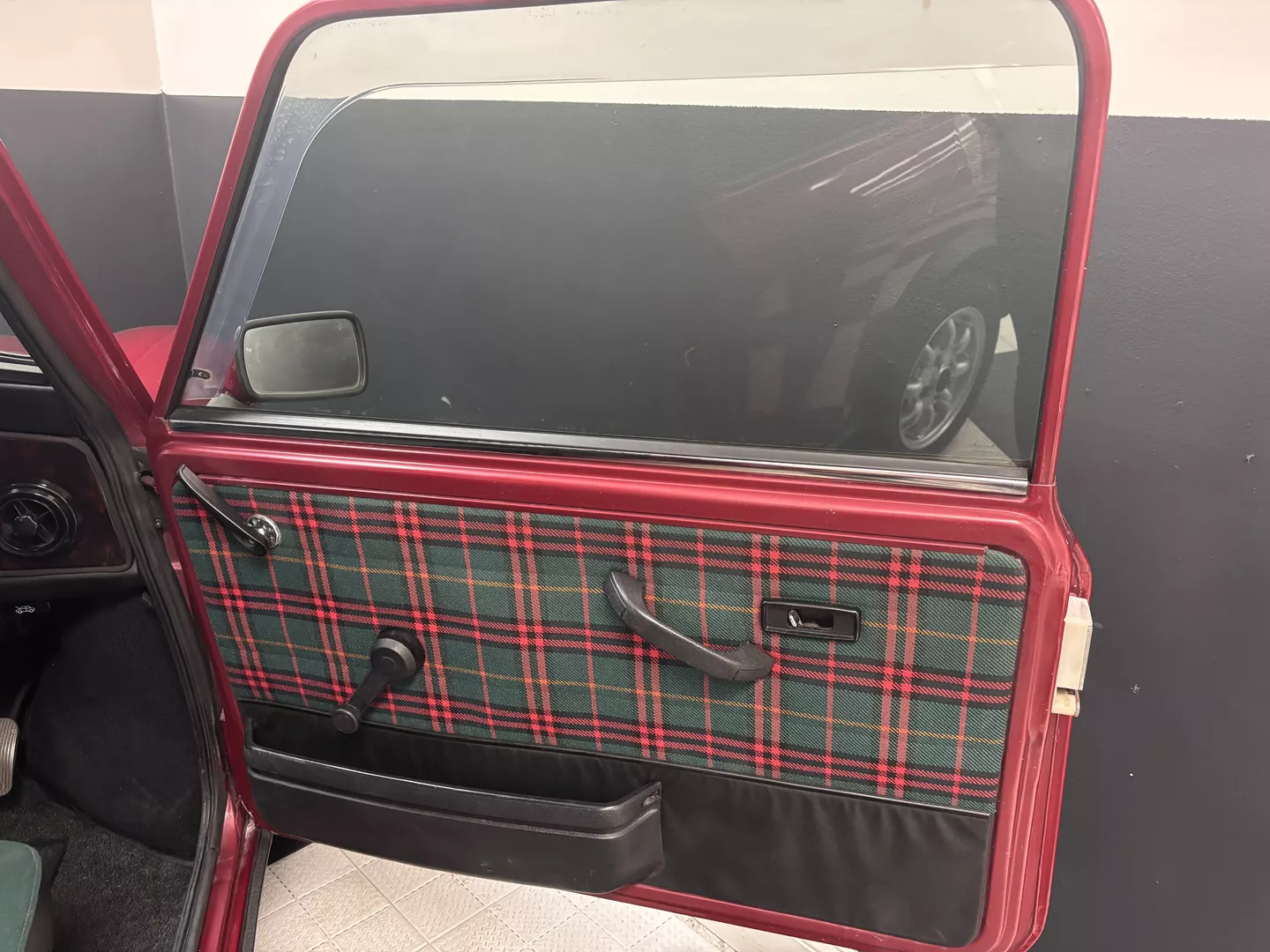 This 1996 Rover Mini Tartan is painted metallic burgundy with a matching roof and Green & Red Tartan interior with red seatbelts. The car interior features an aftermarket head unit, factory red and green tartan door cards as well as factory tartan seats. This Mini has a 1.3-liter 4-cylinder fuel-injected engine with air conditioning. The engine is backed by a 4-speed manual transmission.